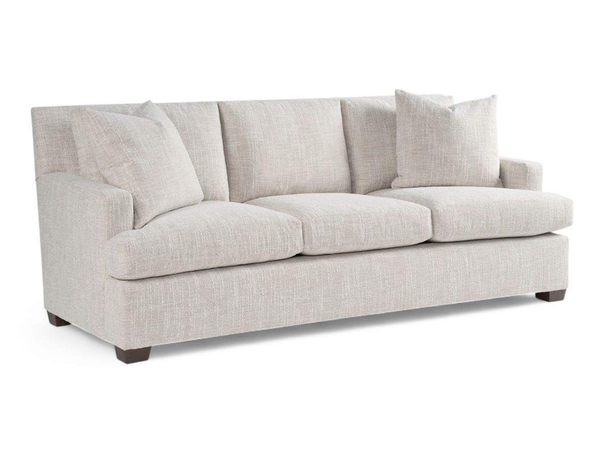 The Emmerson sofa features a clean and elegant design, perfect for modern living spaces. Upholstered in a soft, light beige fabric with a subtle textured weave, it offers both comfort and sophistication. The sofa includes three generously cushioned seats and backrests, complemented by two large, matching throw pillows that enhance its inviting appearance.