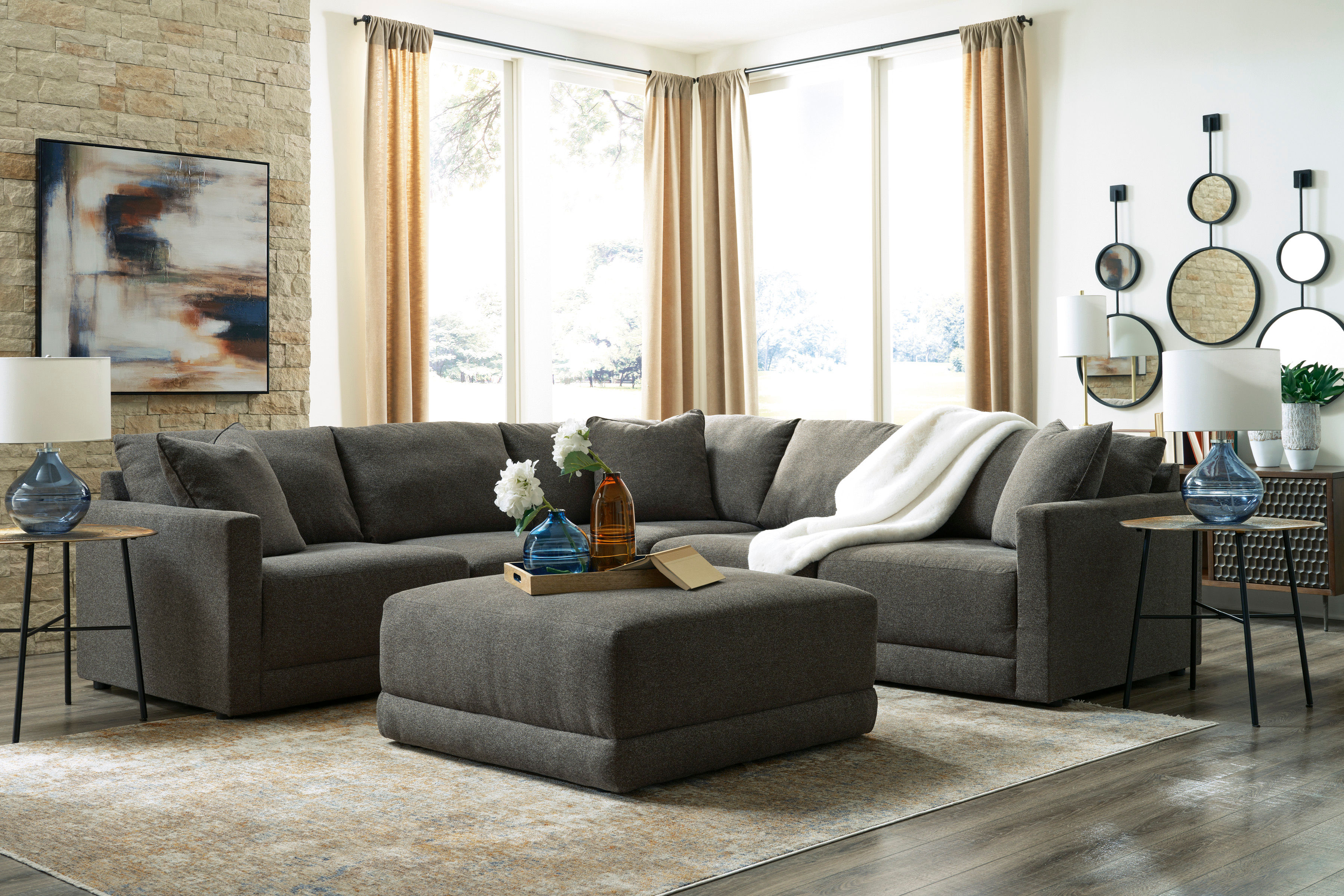 Architecturally inclined with its gently curving profile, the Evey oversized accent ottoman is stunning from all angles. Acting as the focal point in a neutral space, the granite-hued upholstery also creates a blank canvas for adding pops of color.