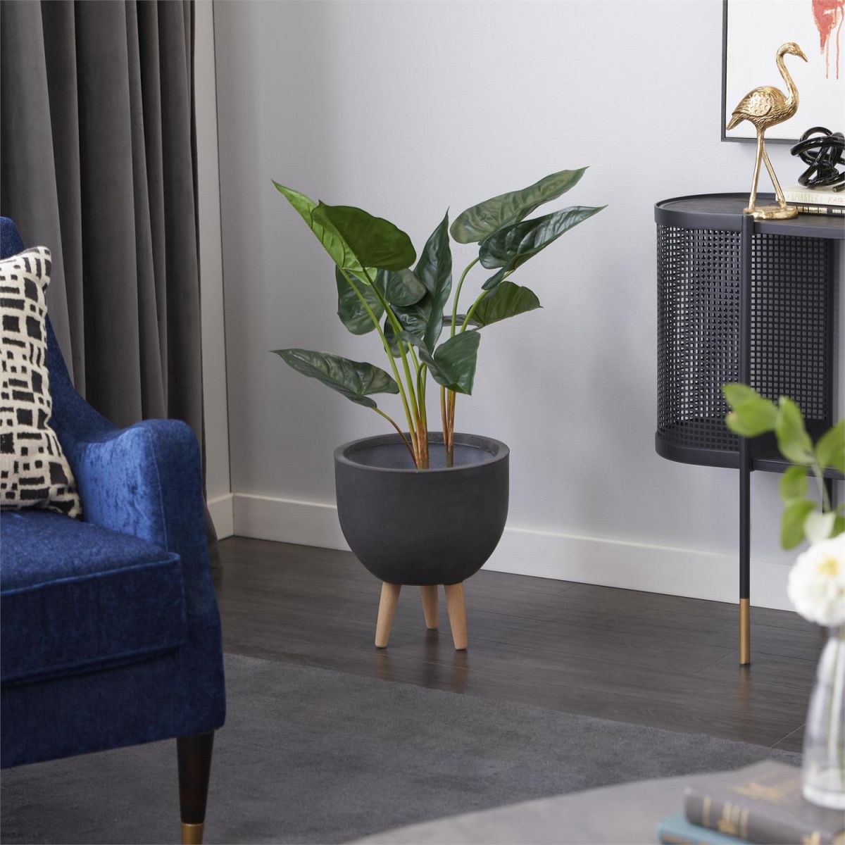 Designed with timeless sophistication, rich old-world textures and warm hues come together for a refined classic taste of luxury. The green indoor outdoor artificial plant is crafted from polyethylene and iron materials, ensuring a sturdy and realistic design. The asymmetrical artificial greenery features green leaves with hints of brown in a matte black pot for a classic look. This faux foliage artificial plant boasts realistic details that replicate the lush beauty of anthurium leaves, perfect for floor display.