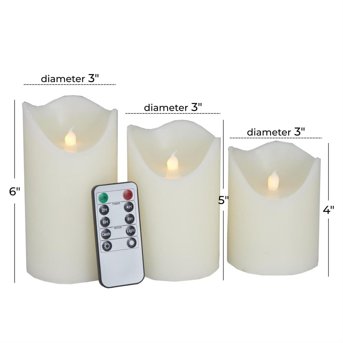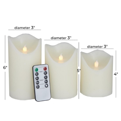 Designed with timeless sophistication, rich old-world textures and warm hues come together for a refined classic taste of luxury. The white indoor outdoor flameless candle set is crafted from high-quality LED wax and durable materials to ensure longevity. Round decorative flameless candles set features a smooth matte white wax body finish, adding sophistication to any setting. This wax set of 3 flameless candles features a realistic wax-like finish and flickering LED lights that are dimmable with a remote, making it a stylish lighting option.