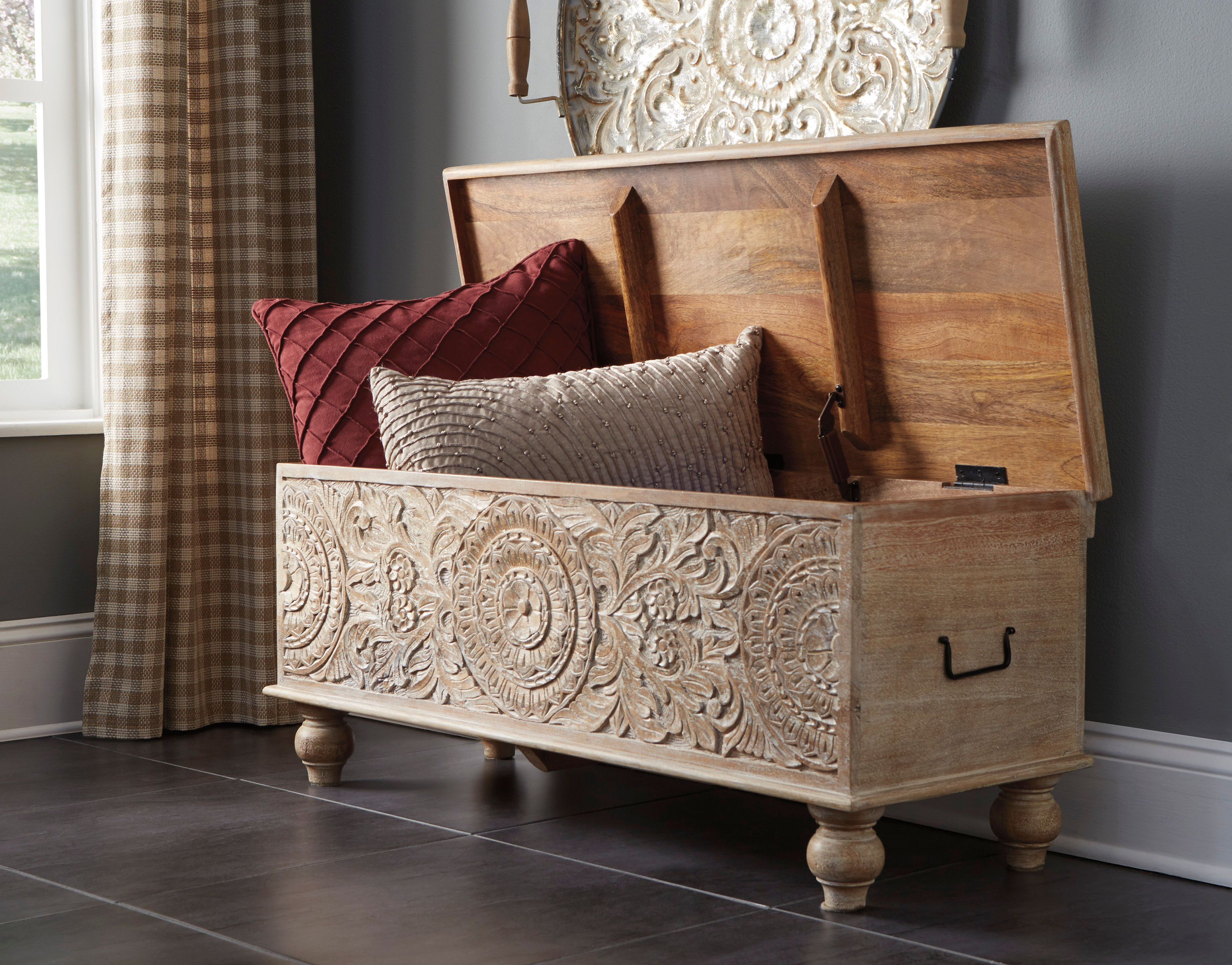 Merging practical storage with an exotic sense of flair, the Fossil Ridge storage bench stands out from the crowd in an intriguing way. Its grainy wood is beautified with an antique white finish, and the ornamental medallion carvings are pure artistry.