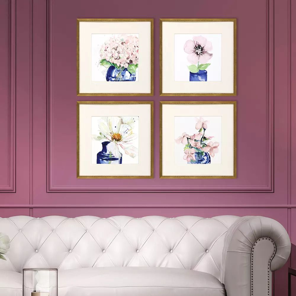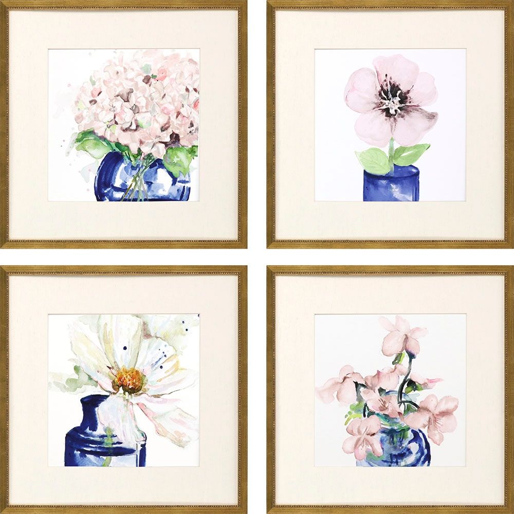 Cobalt blue vases and pink flowers feature premium matting. Framed in a traditional antique gold wood with beaded lip.
