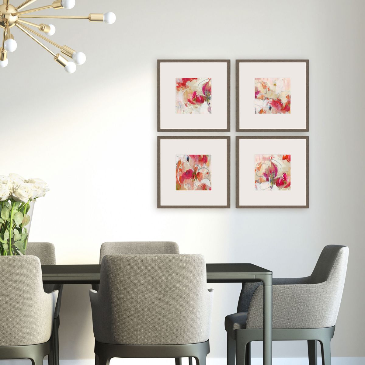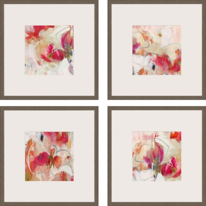 Abstract florals in vibrant shades of pink are perfect for a modern space. Matted in light buff and framed in a medium wood-grain finish molding.