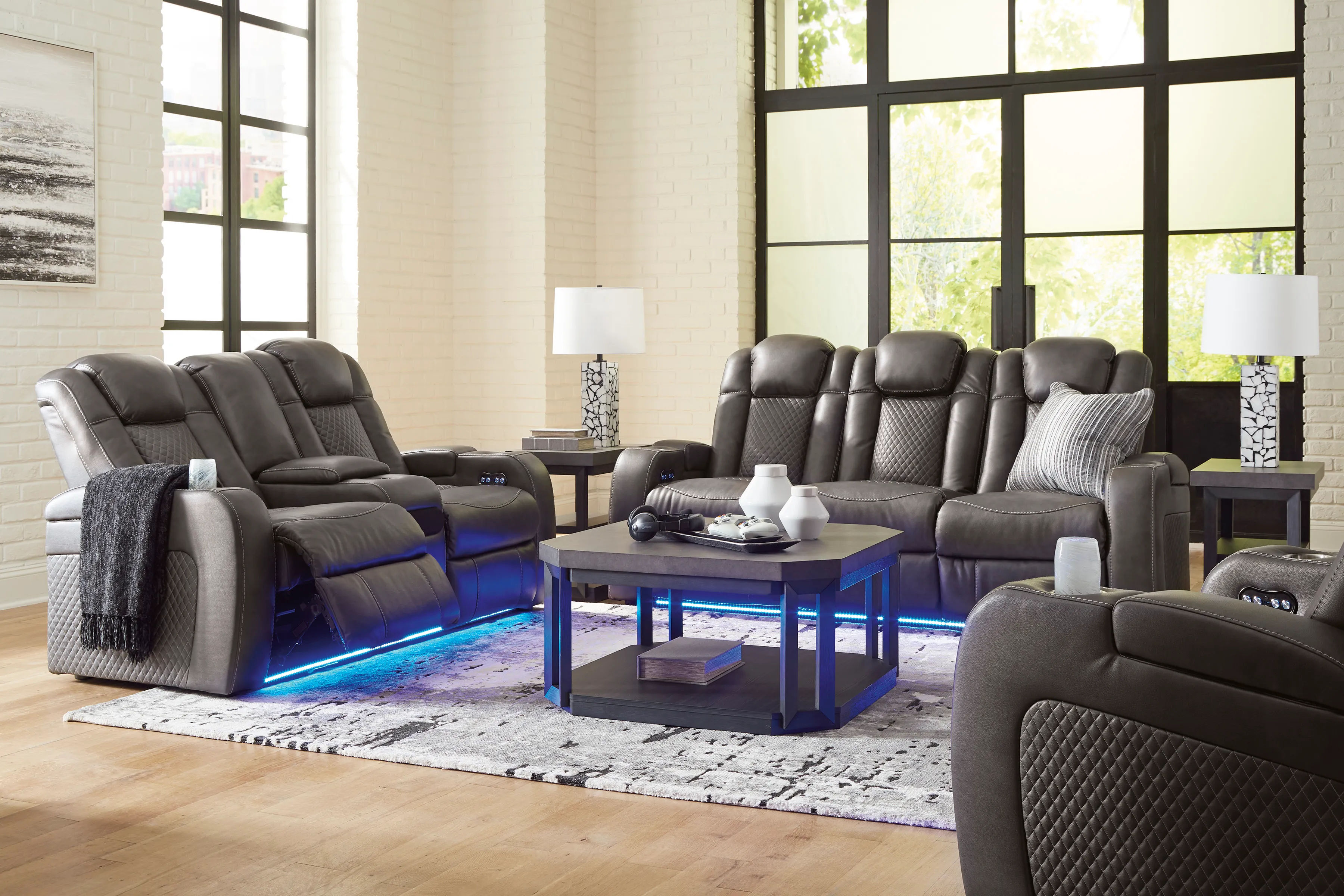 The Fyne-Dyme power reclining sofa goes beyond basic comfort. It upgrades the everyday, turning your living room into an entertainment hub. Don’t want to leave your seat? Keep essentials in reach with assorted charging options, cup holders and storage arms. You can create an even cooler vibe for family movie nights and friendly gaming matches with LED lights. And your sleek style isn’t compromised—its diamond stitching and streamlined arms recall the aesthetics of luxury automobiles.