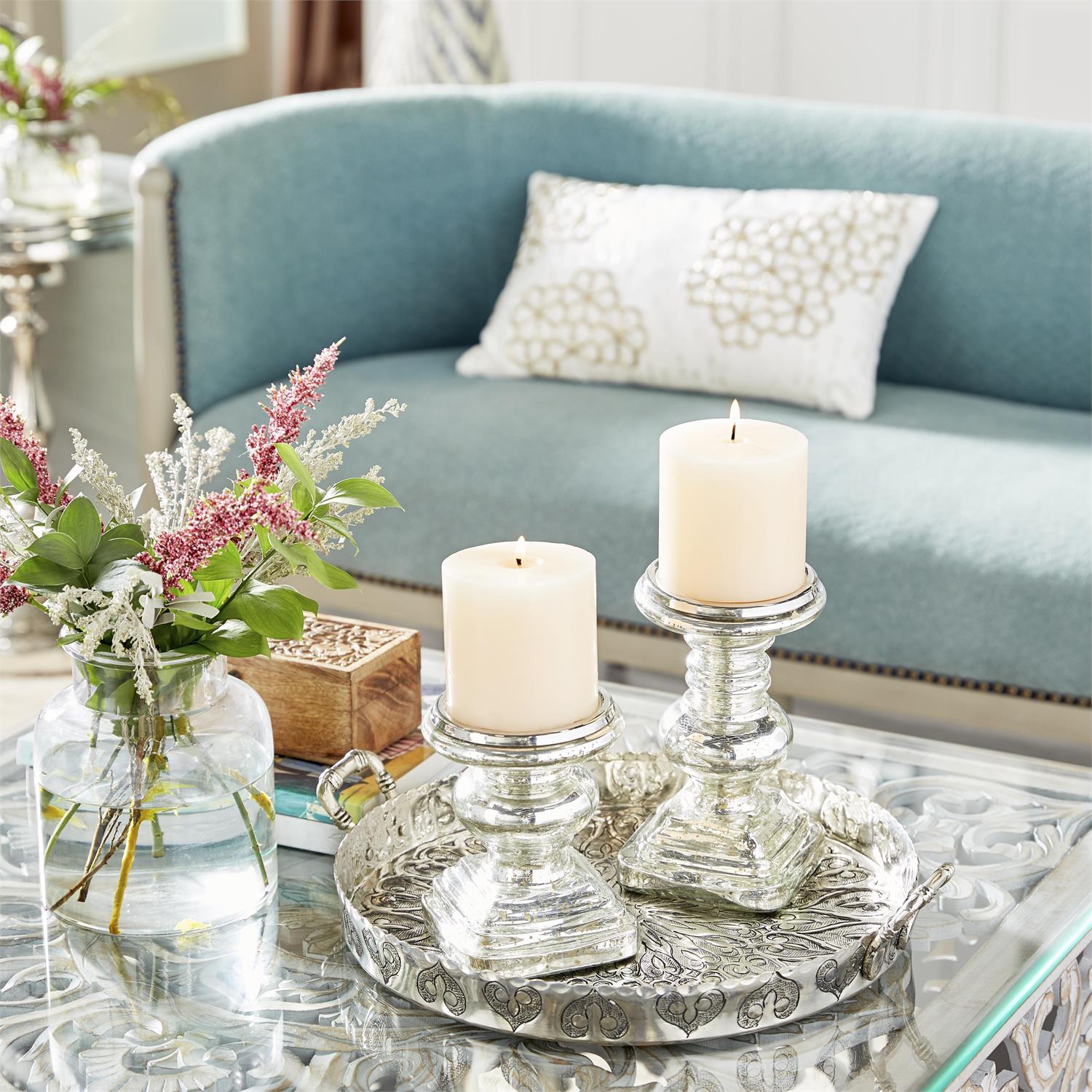Designed with timeless sophistication, rich old-world textures and warm hues come together for a refined classic taste of luxury. This silver decorative candle holder set is crafted from durable glass, making it both durable and elegant. Round candle stand holder set features a silver color with a mercury finish and brown speckles, creating an elegant and timeless look. Glass set of 2 candle holders featuring a turned wood-inspired design and a metallic speckled pattern adds unique charm to any space.