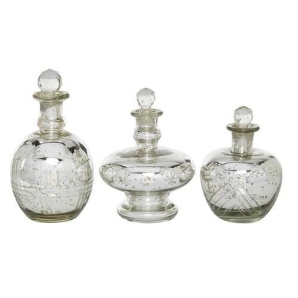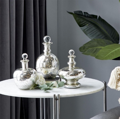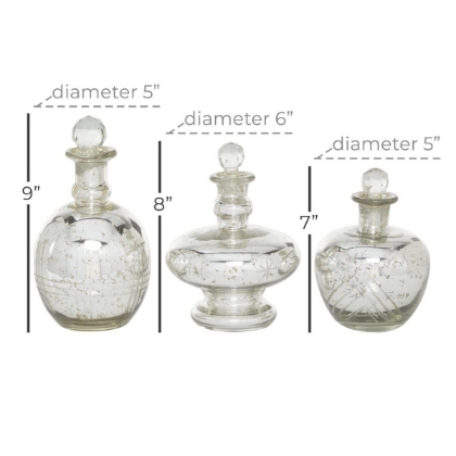 Infuse your home with romantic nostalgia and timeless grace, where ornate and antique details create a sanctuary of charm and warmth in the home. Crafted from quality glass materials, this silver living room decorative jars set exudes an air of vintage elegance. Round decorative storage jar set comes in a mercury silver finish, adding a touch of elegance to any room with its subtle brown speckles. This glass set of 3 decorative jars boasts unique details, including sleek looks and crystal stoppers for easy opening.