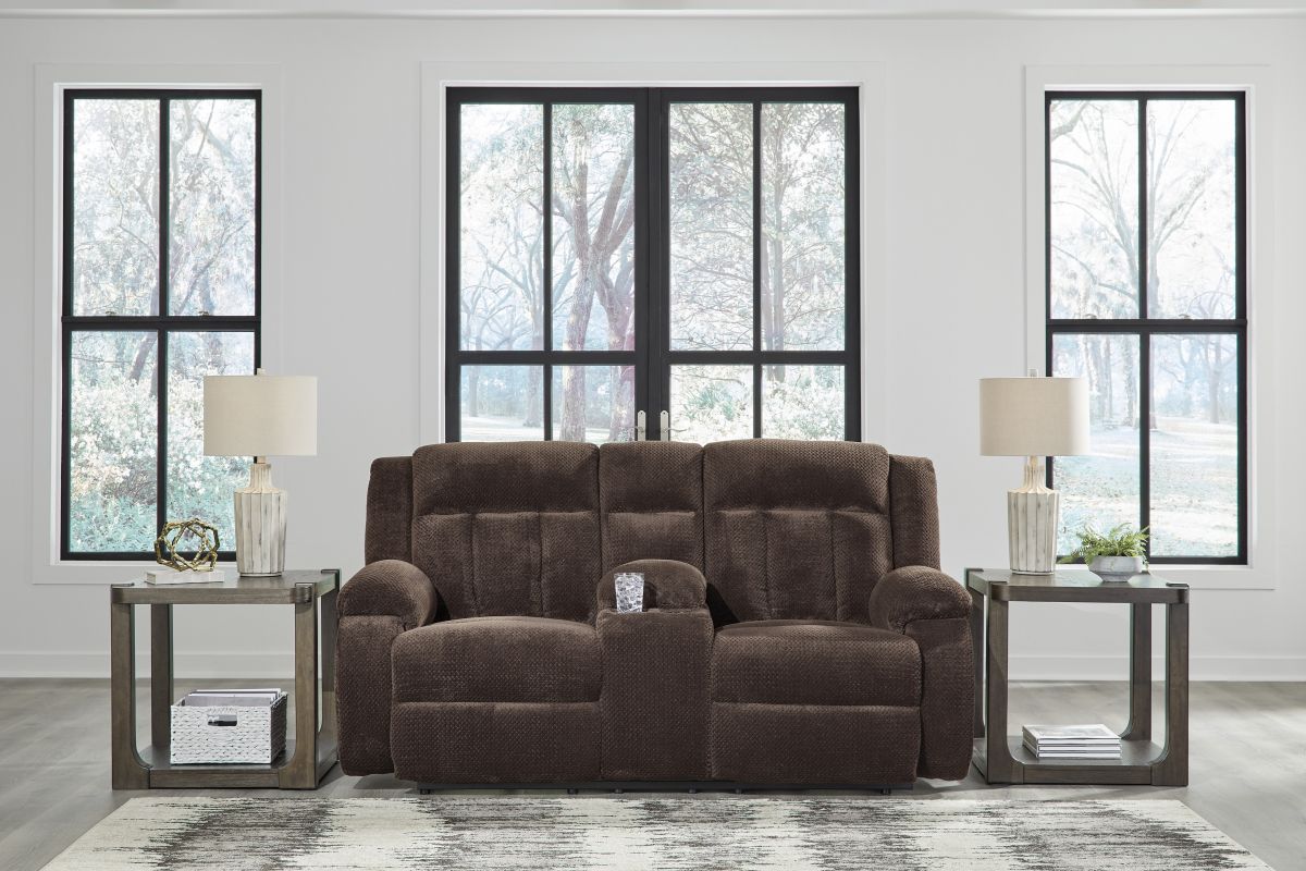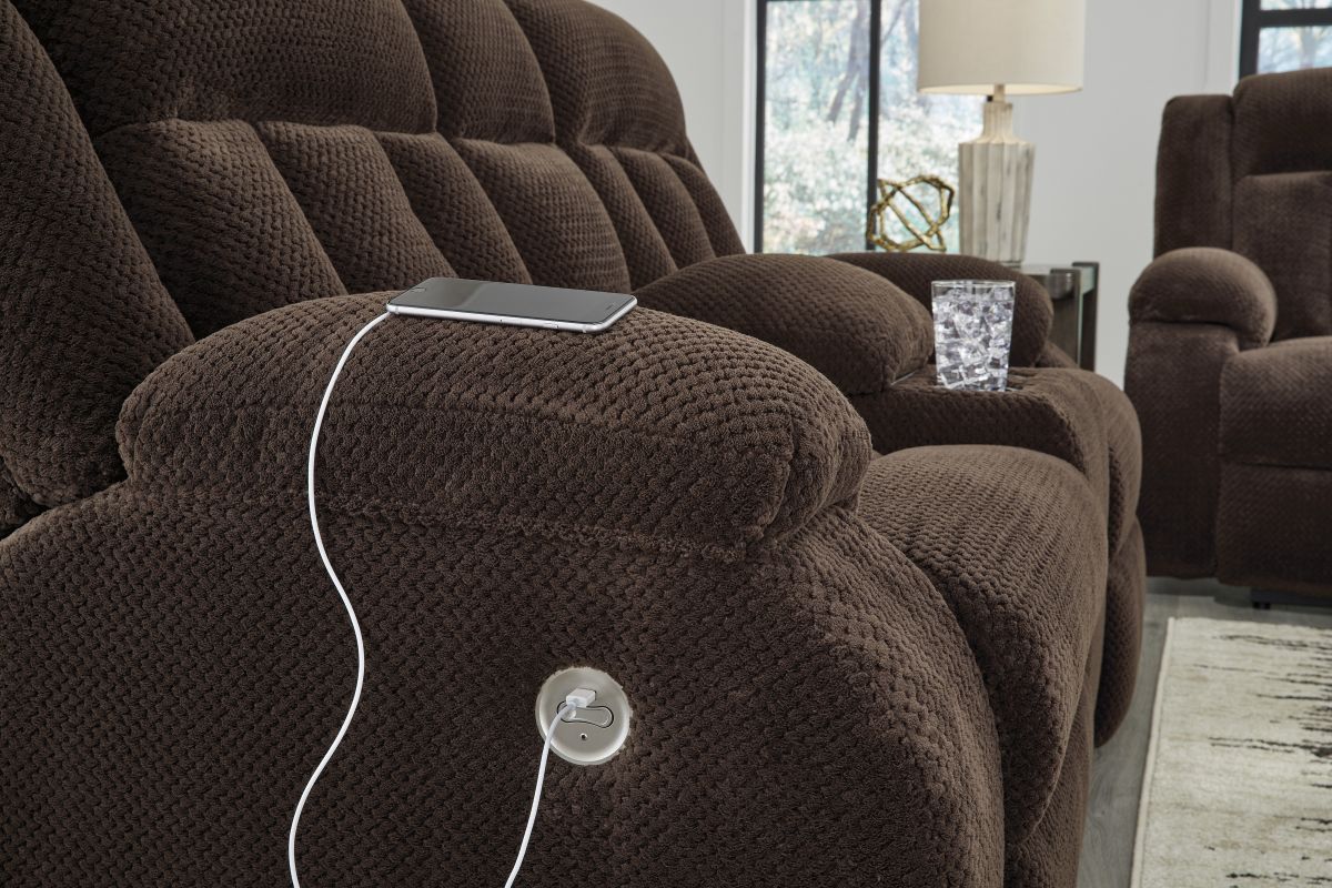 There's no need to sacrifice looks for comfort—this power reclining loveseat with console serves up both, plus a richly relaxed sense of style. Its chocolate-hued velvet upholstery is ultra soft, with a plush waffle weave for an added layer of interest. The overstuffed pillow top armrests are custom made for lazy afternoon catnaps. A one-touch power control takes the pleasure of reclining to a higher level, while cup holders and USB charging help keep essentials close by.