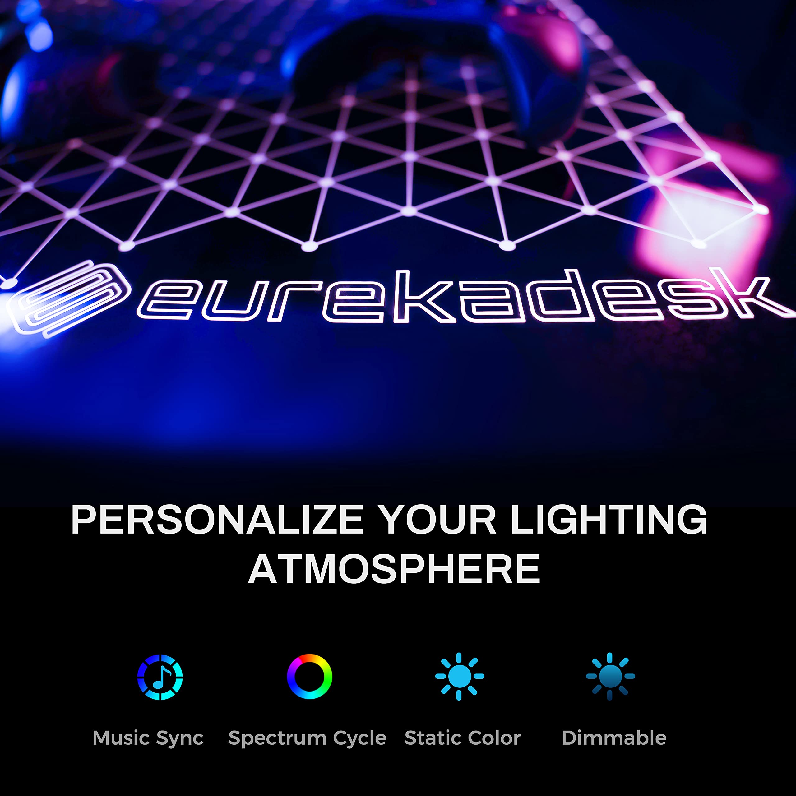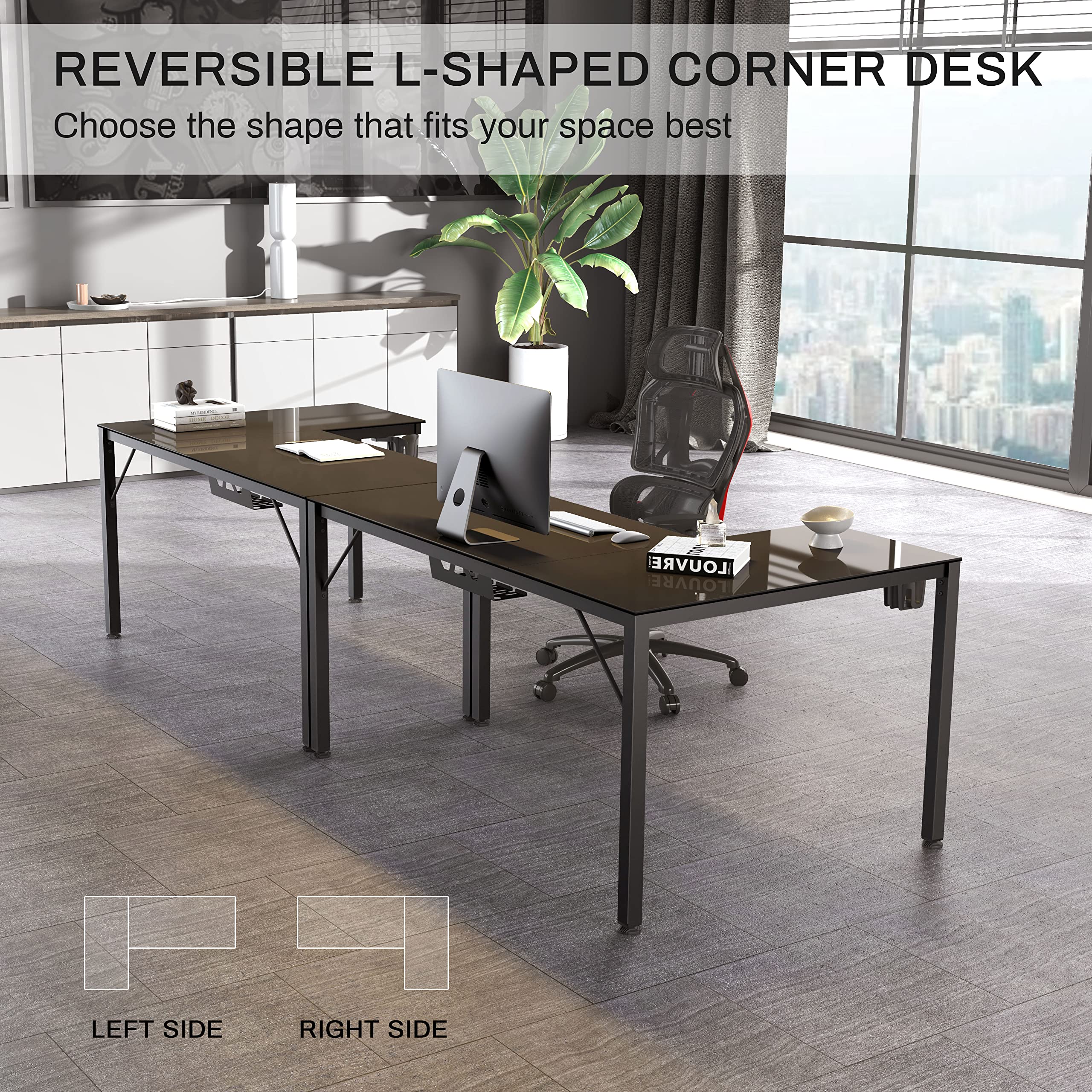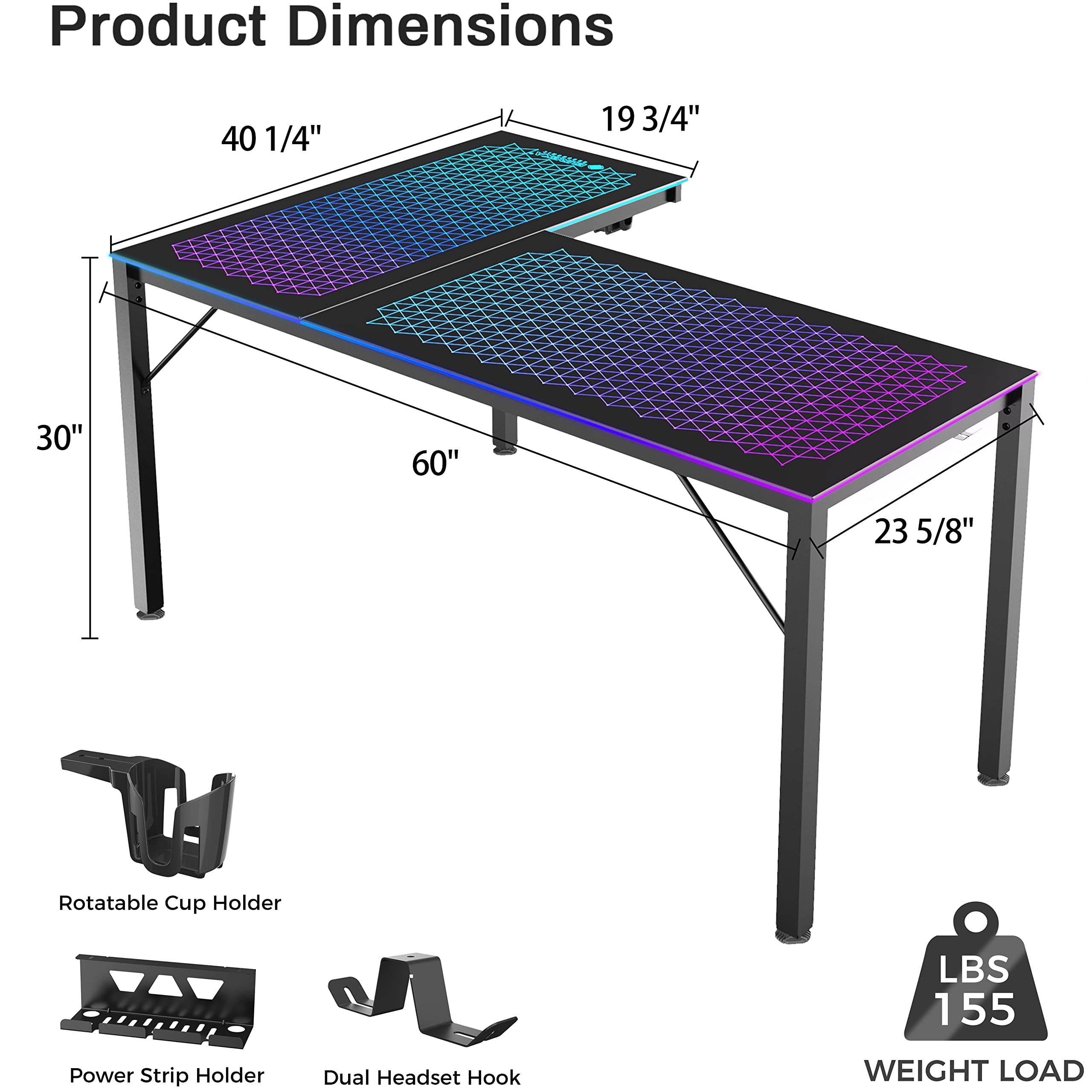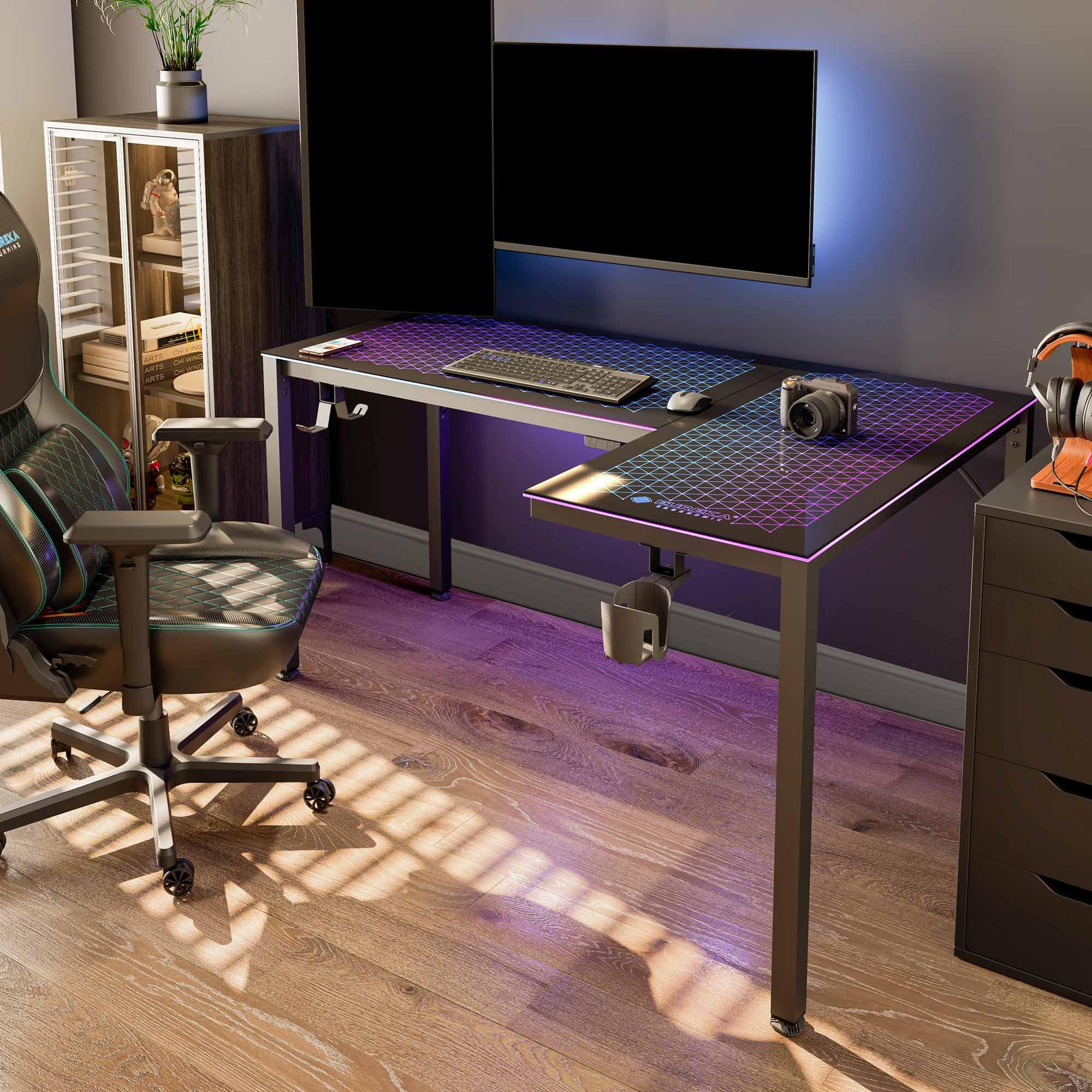Music Sensing RGB LED Lights Glass Gaming Desk, 60 Inch L Shaped Reversible