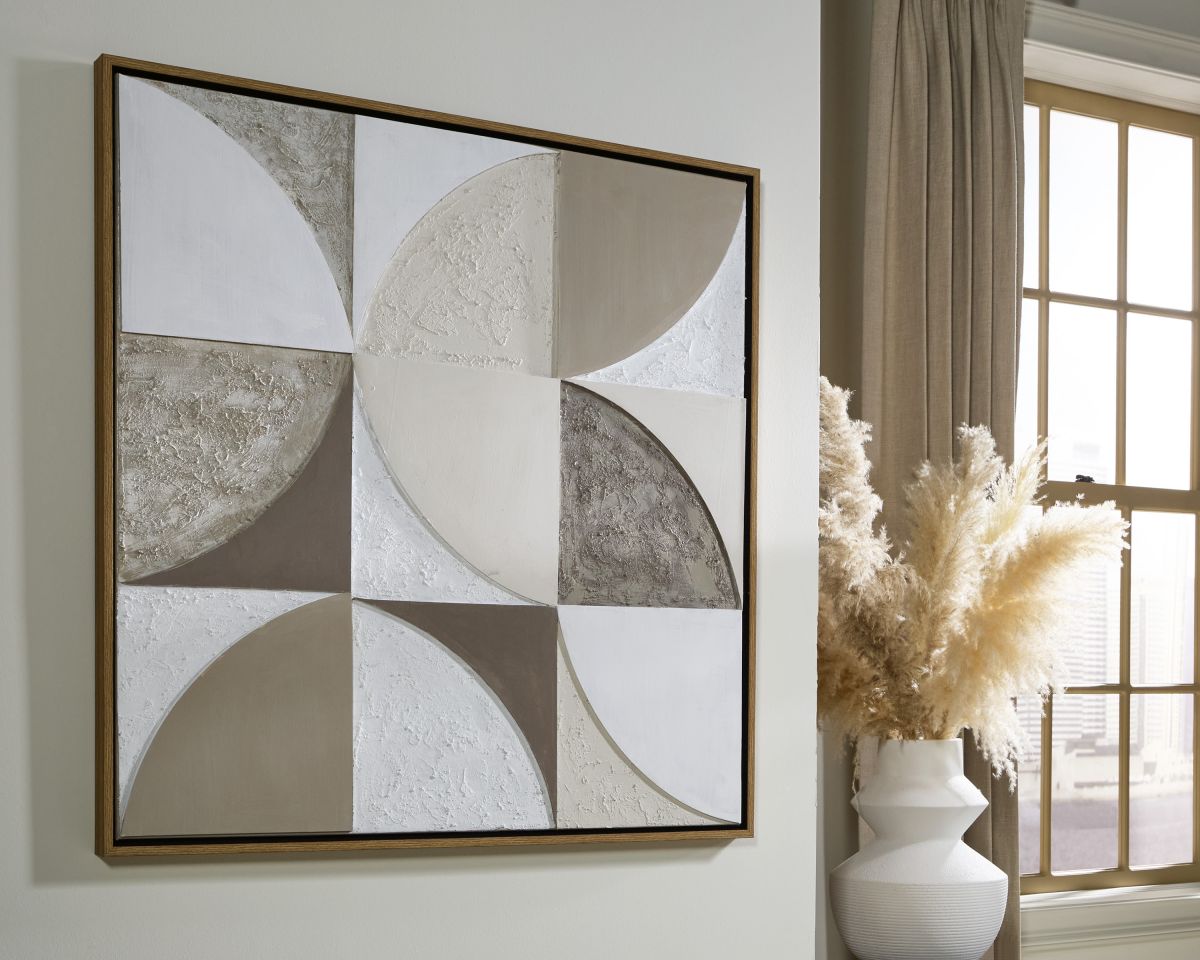 Make a bold geometric statement with this wall art. Its hand painted design balances curves and angles in soothing neutral tones, creating a captivating sense of movement and depth. Expertly finished with a light brown frame and four-way hanging versatility, this contemporary piece brings gallery-worthy style to your home.