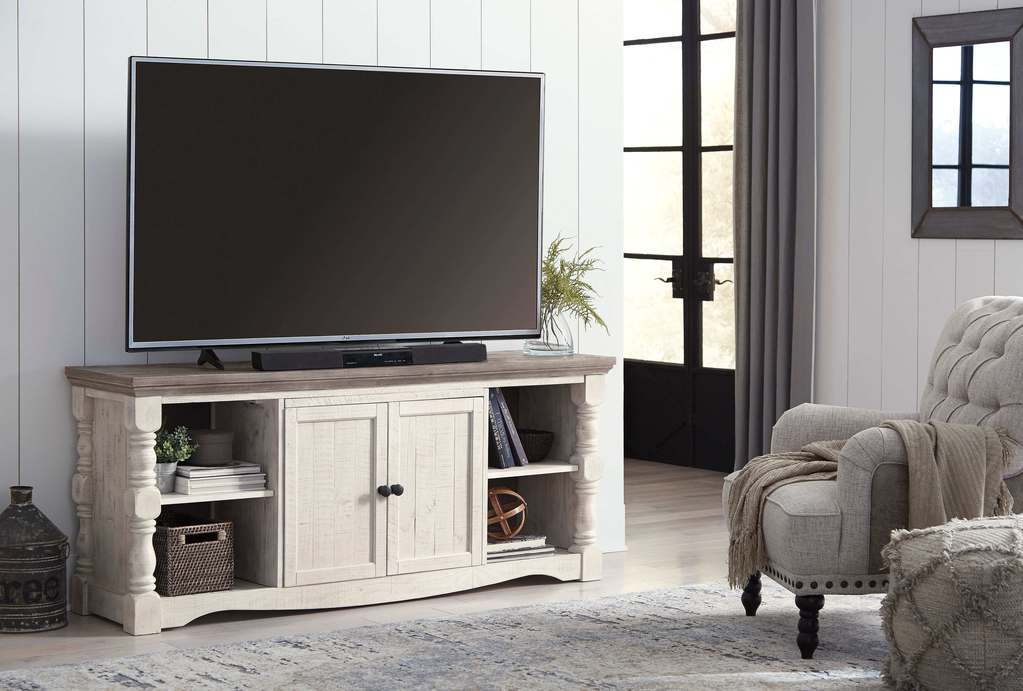 Set your sights on modern farmhouse style with the Havalance XL TV stand. Distressed two-tone treatment blends a weathered gray with vintage white for an utterly charming effect. Turned posts lend a hearty, substantial look that feels right at home, while plenty of open shelving makes the aesthetic anything but heavy.