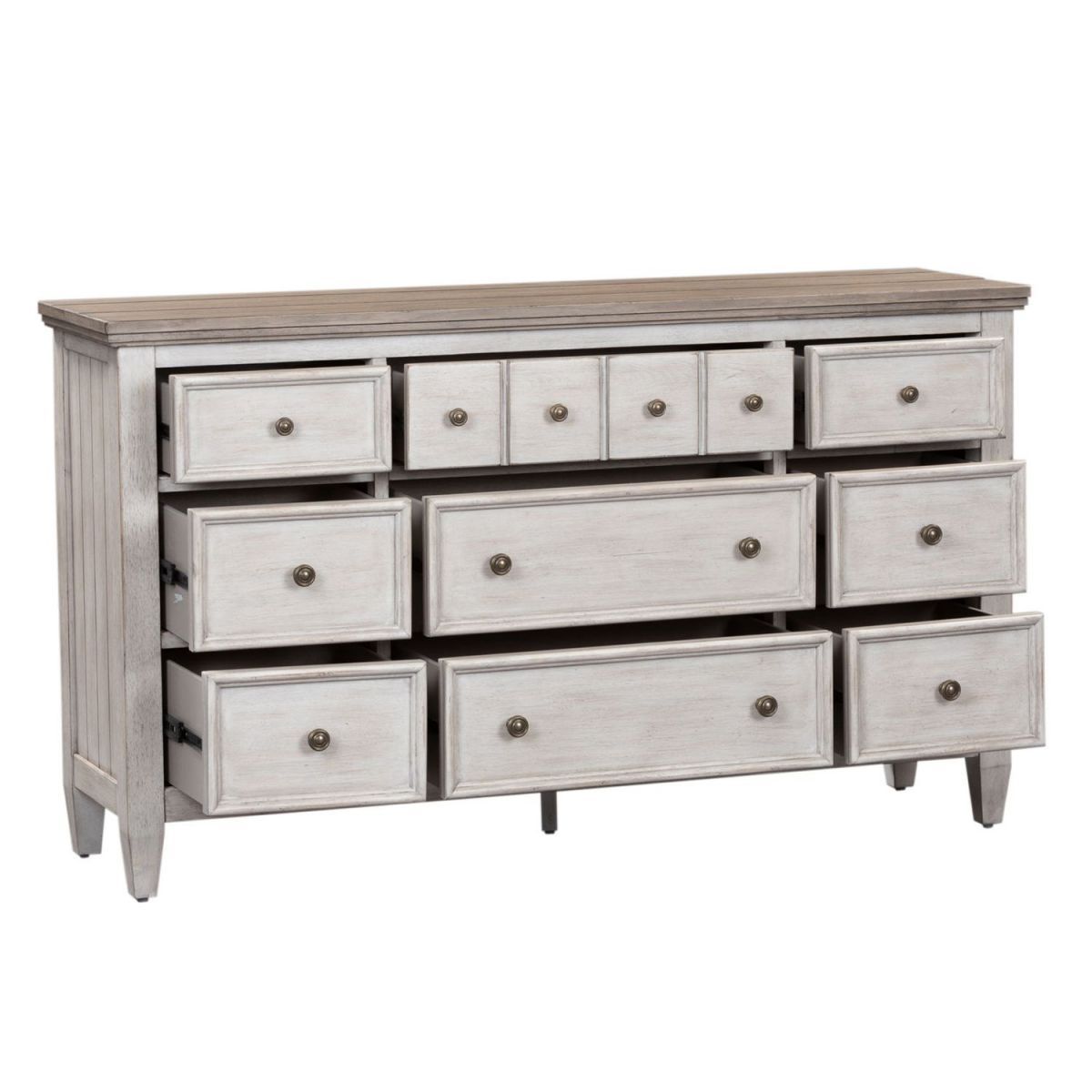 The Heartland 9-drawer dresser is sure to make a statement in any home, as its heavily distressed finish is adaptable to any space. The antique white finish and tobacco tops are accented by raised panels and antique brass hardware. The many drawer sizes allow you maximize storage, with the top drawers being felt lined and the bottom drawers being cedar lined. The wood framed drawers and raised panels on the dresser sides and top creates a classic cottage style.
