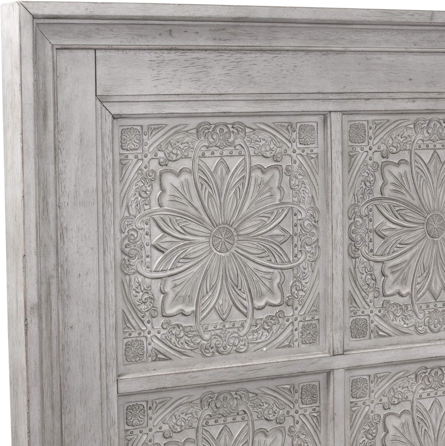 Fall into this farmhouse style Heartland panel bed. Crafted with rubberwood solids and oak and birch veneers, the antique white finish features artistic distressing, which gives this piece unique characteristics in line with an antique appeal. Beautiful antique ceiling tile panels on the headboard and heavy top crown molding around raised panels on the footboard complete this farmhouse look. Never question the reliability of the bed due to the bolt-on rails and center supported slat system.