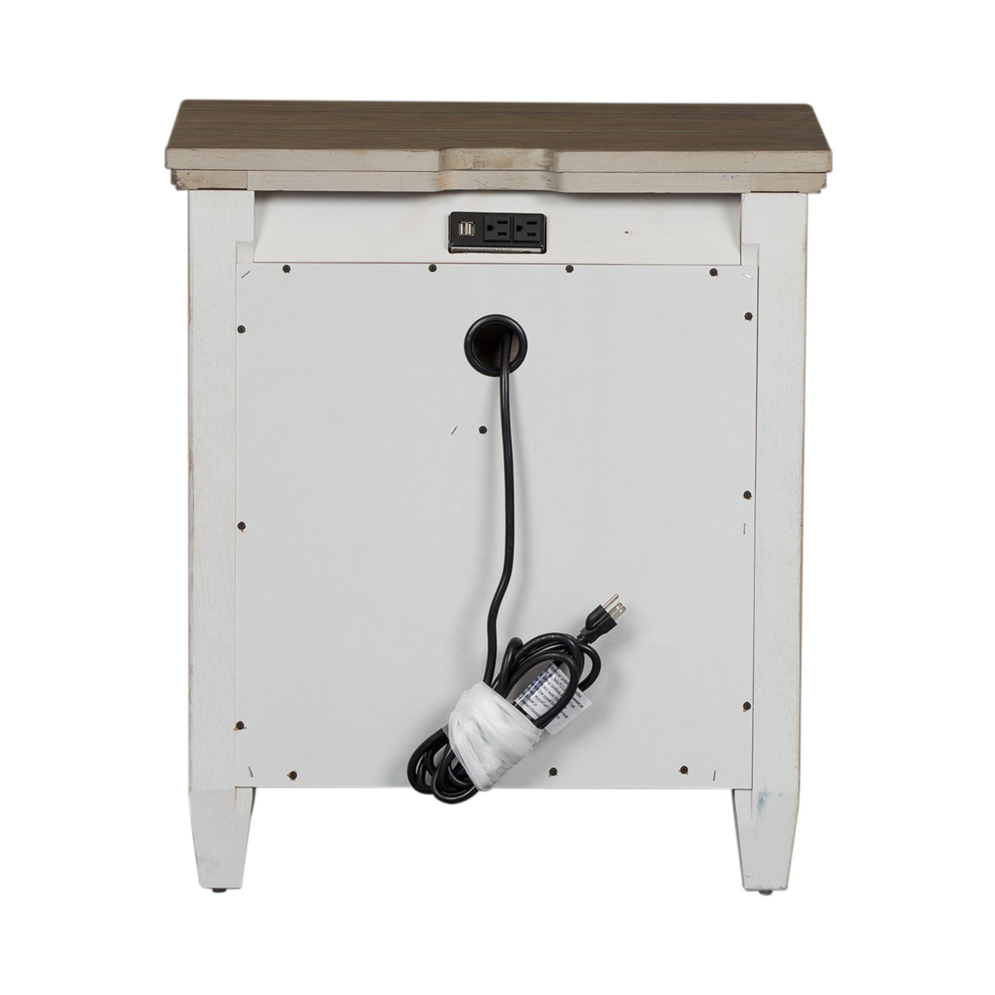 The Heartland night stand is sure to make a statement in any home, as its heavily distressed finish is adaptable to any space. Crafted with rubberwood solids and cathedral white oak and birch veneers, this two-toned piece features a felt line drawer, cedar lined bottom drawer, with wood framed drawer fronts, accented by antiqued brass knob hardware. With today's electronics in mind, this piece includes a 2-port charging station for user convenience, making multi device charging a breeze. Maximize storage with the convenient bottom shelf, perfect for storing your everyday items.