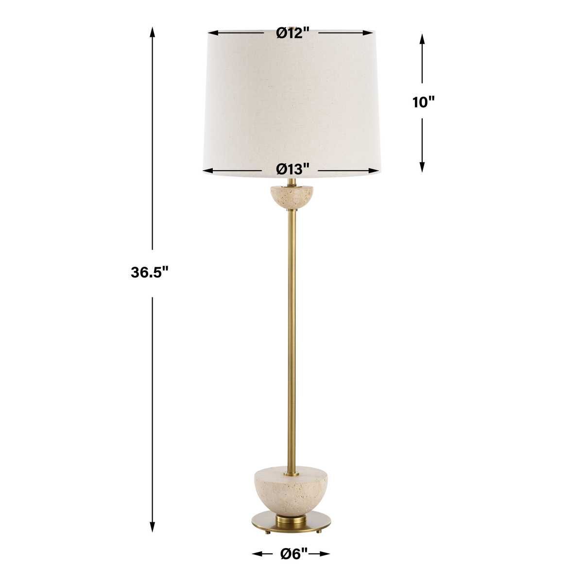 The Hemisphere Buffet Lamp showcases a sleek brushed brass base, elegantly accented by two Travertine half spheres at either end, adding a touch of refinement. The slightly tapered round hardback shade is covered in an oatmeal linen fabric with light slubbing.