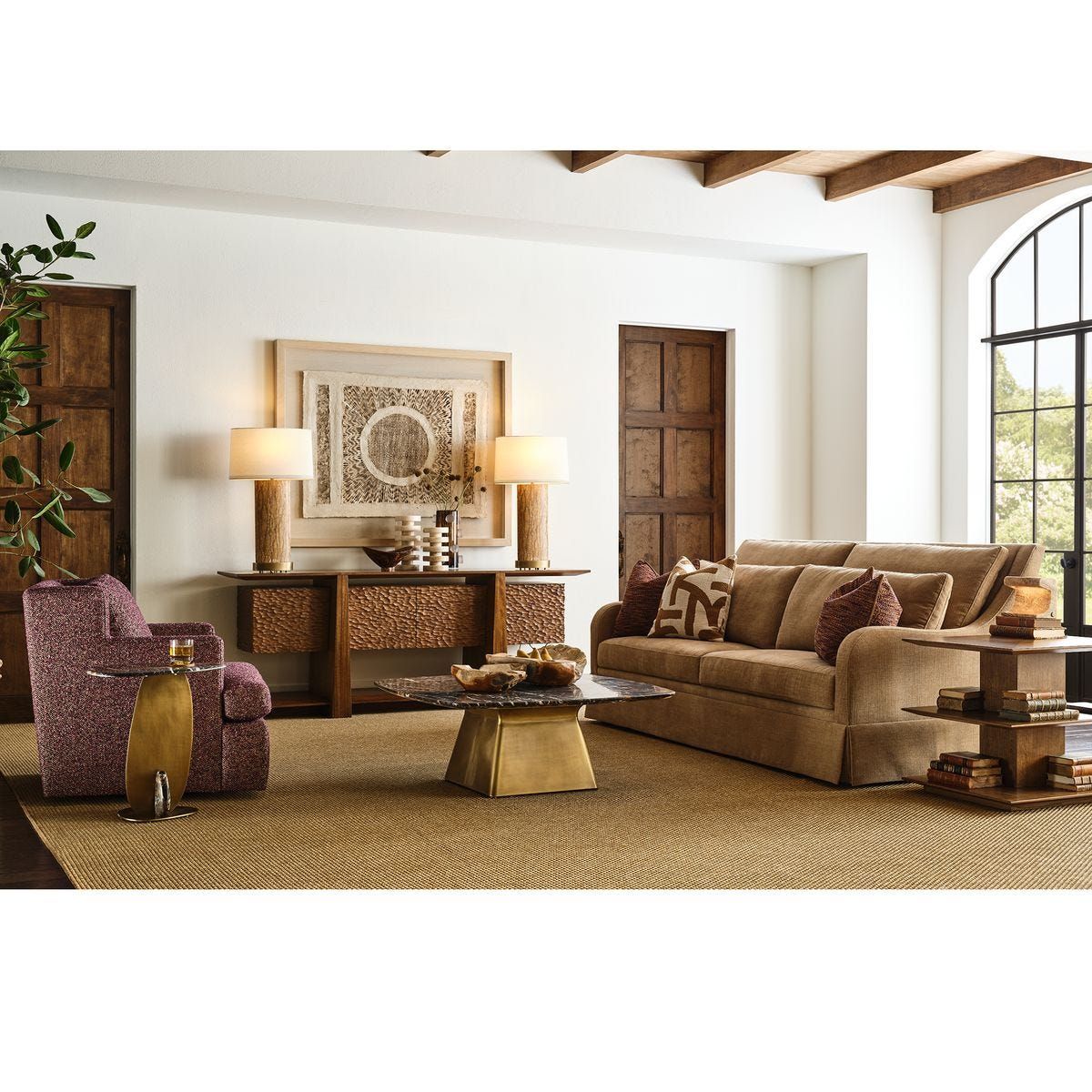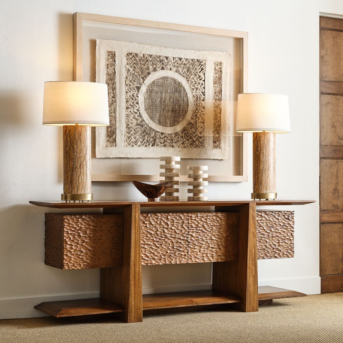 Inspired by mid century architecture, the Hewned Joist Cabinet features three floating layers all in a golden brown finish: the top and base shelves with Paldao wood details, and the artisan-carved four door cabinet body. Each compartment contains a hole for wire management.