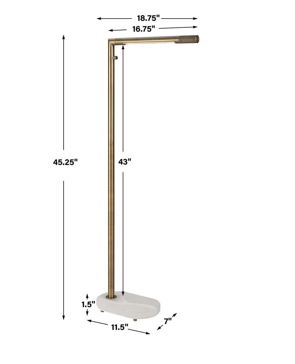 The sleek and minimalist design of the Highlight Floor Lamp is perfect when you need a lot of light but have limited space. Finished in an antique brass, both the post and LED arm are multi-directional and can independently rotate 350 degrees. The post is built to a height for reading by a sofa or chair and contains a knurled rotary dimmer directly underneath the arm. The capsule-shaped alabaster base can be easily rotated and tucked discreetly out of the way. The four feet were added for stabilization on carpet and allow cord control from any direction. The LED light is an integrated light system - no bulb required. Produces 54,000 estimated hours of illumination.