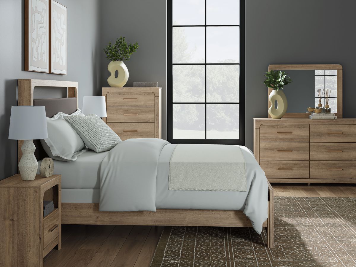 The natural wood tones and clean lines of this dresser with mirror echo your easygoing style sensibilities. With a warm finish and replicated oak grain, its carefree character lightens up your bedroom. Curved inner corner details soften the look, while sleek bronze-tone hardware modernizes the feel.