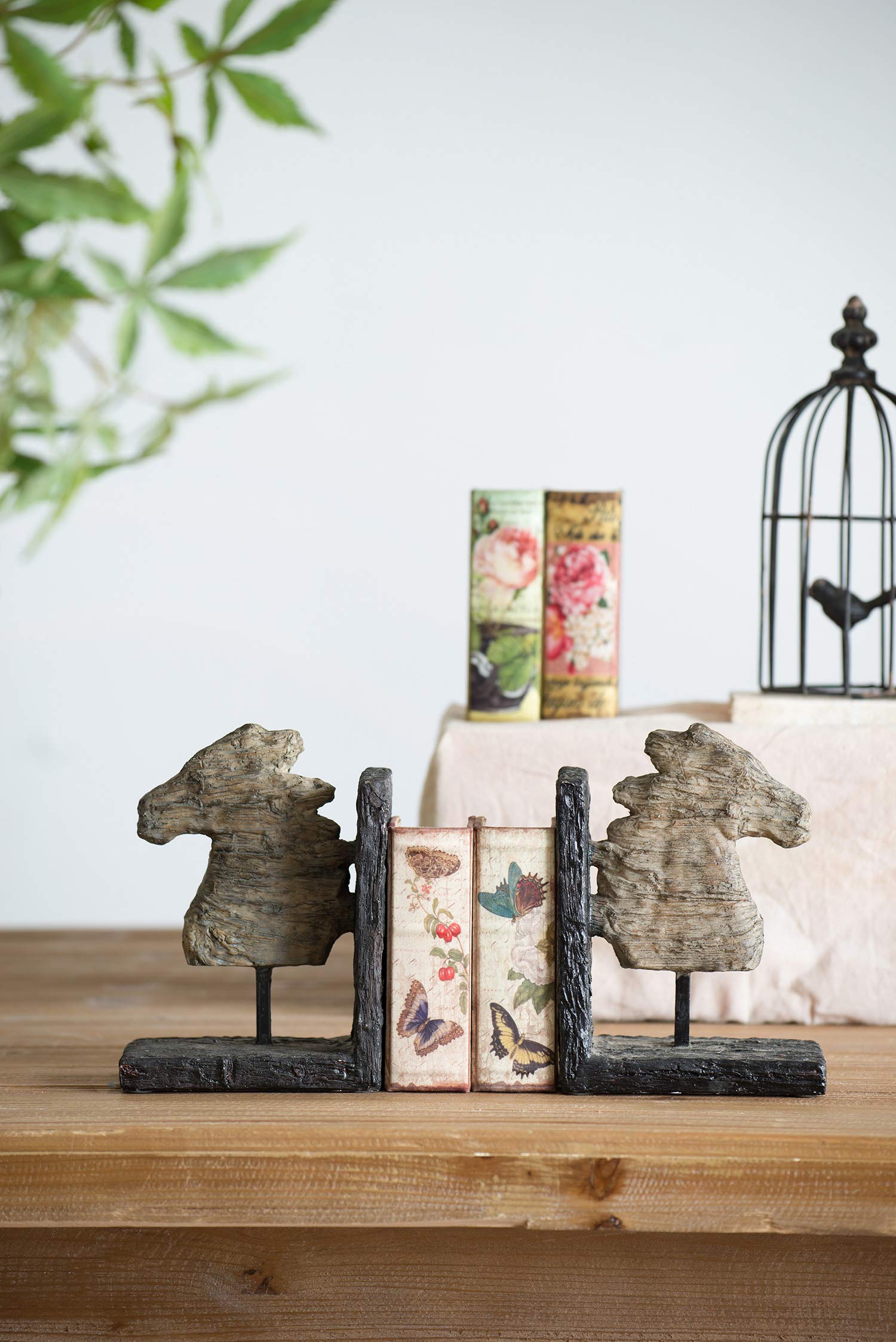 These dramatic, weathered Horse Bookends will keep your book collection well-organized in classic vintage style. Whether used together on a large shelf or placed separately, these horse head bookends feature an aged, faux wood finish and industrial black metal stand. Let these bookends add noble style to a traditional living room, rustic office, or farmhouse kitchen.