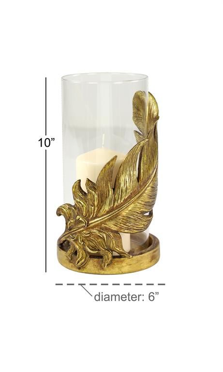 Designed with timeless sophistication, rich old-world textures and warm hues come together for a refined classic taste of luxury. Gold resin candle holder with clear hurricane glass. Decorative candle holder with an ornately sculpted textural feather with a metallic gold finish wrapping around the tall hurricane glass, metallic gold base/candle plate. Decorative candle holder with an ornately sculpted textural feather with a metallic gold finish wrapping around the tall hurricane glass.