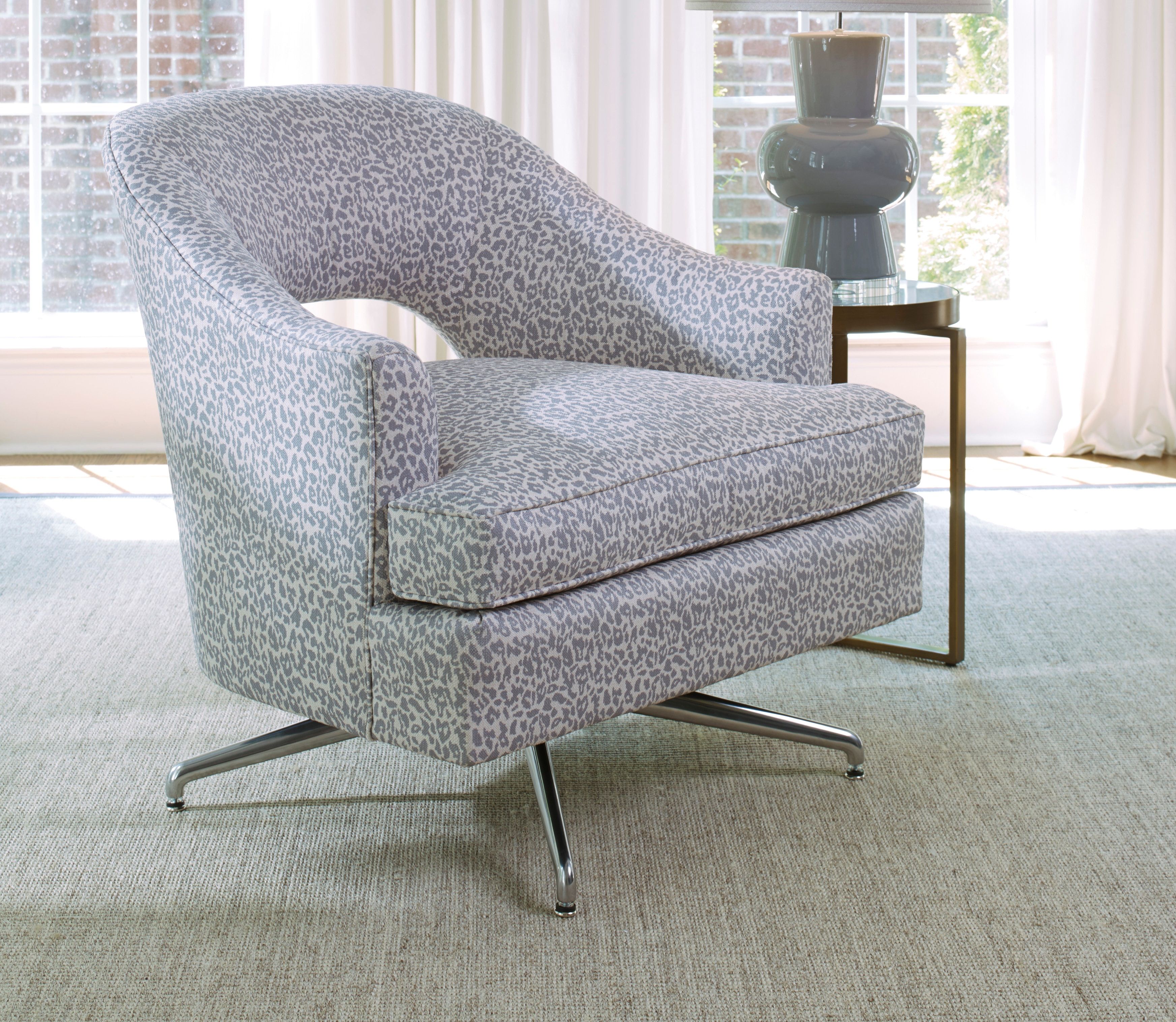 Experience glamorous style with the Jamie swivel accent chair, made with a gray leopard print leather upholstery and a metal base with a nickel finish. The endless style that this chair will bring is sure to upgrade any room in your home to the next level. The 360° swivel enhances your comfort and helps you watch your favorite shows easily.