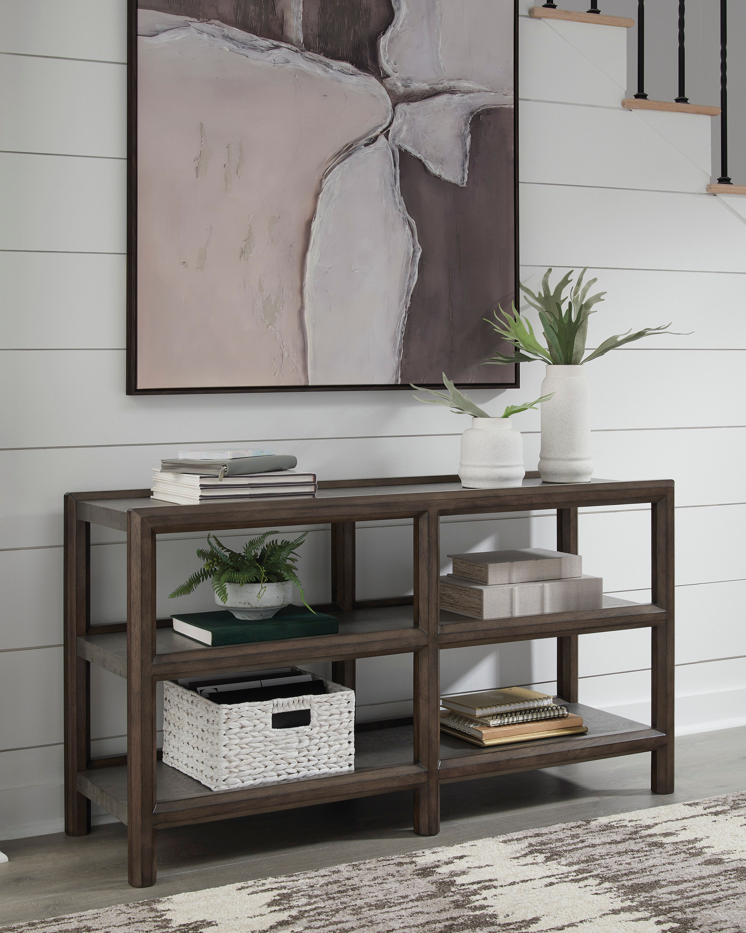 Master the art of mixed-material design with this sofa table. It sports an urban vibe, with faux cement lending an industrial edge to the contrasting dark brown finish. For a functional touch, lower shelves showcase your decor in style. Detailed mouldings on the side add even more cool character.
