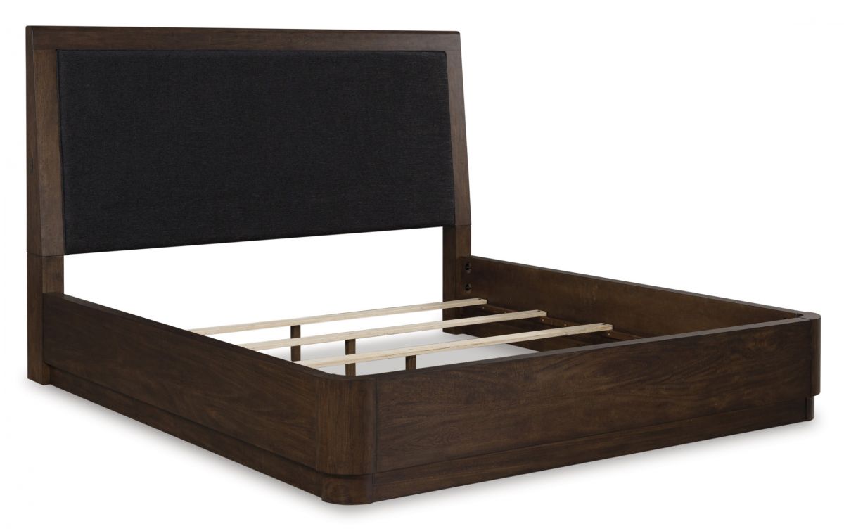 Casual contemporary styling with a decidedly modern vibe. Bathed in a rich dark brown finish, this king upholstered panel bed is warm and inviting. Full wrap-around rails set to the floor adorn your restful retreat with on-trend elegance. A cozy upholstered headboard with layback comfort features USB charging to keep your electronics at the ready. What a simply stunning way to achieve the bedroom of your dreams.
