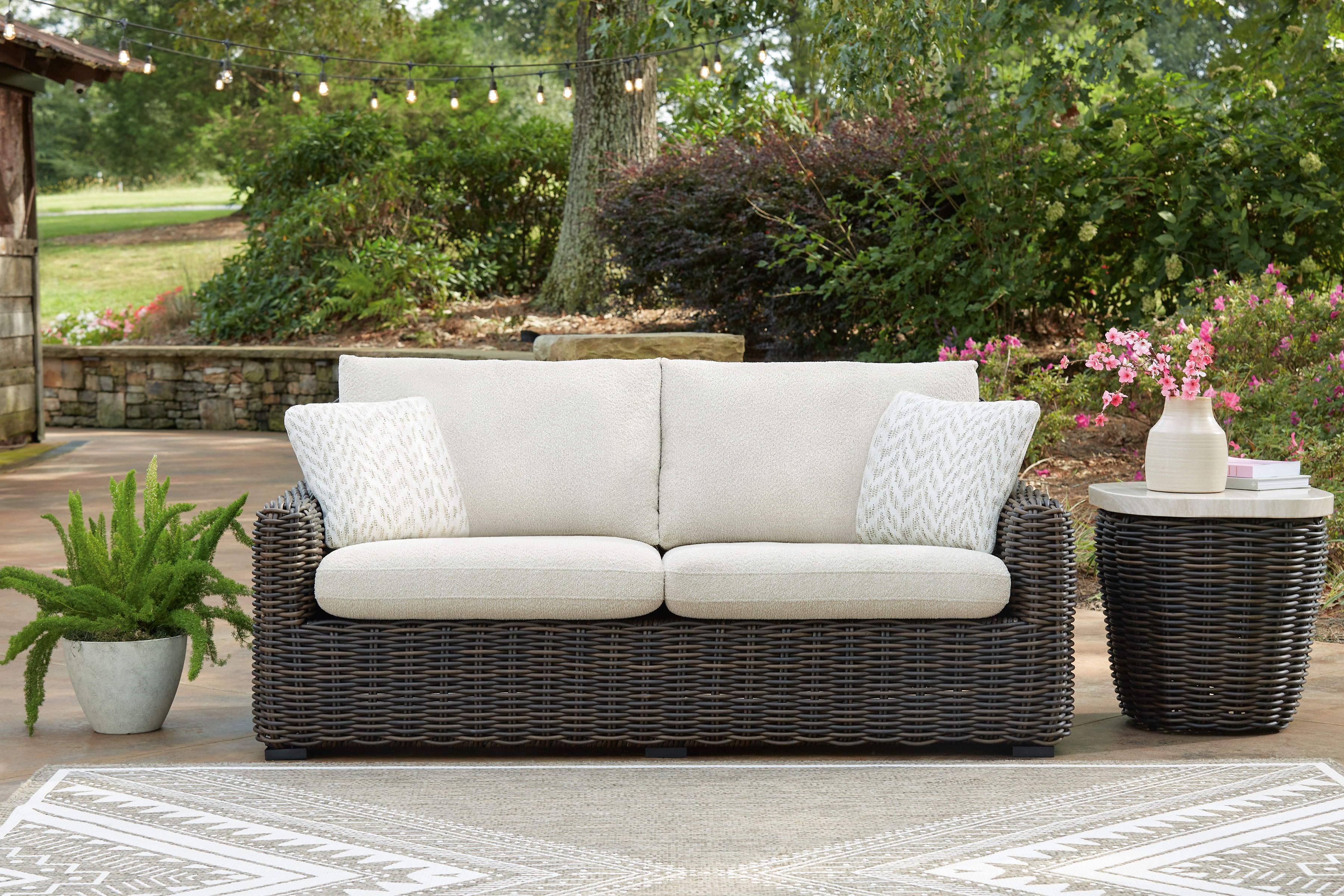 Add luxury, convenience and durability to alfresco fun. This outdoor end table captures the textural beauty of wicker while withstanding the elements, from rain to shine. With its marble-look aluminum top, you can stylishly keep your pool-side drinks or reads in reach.