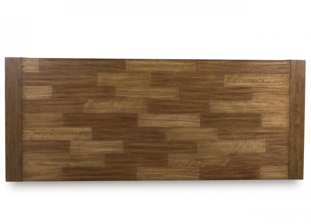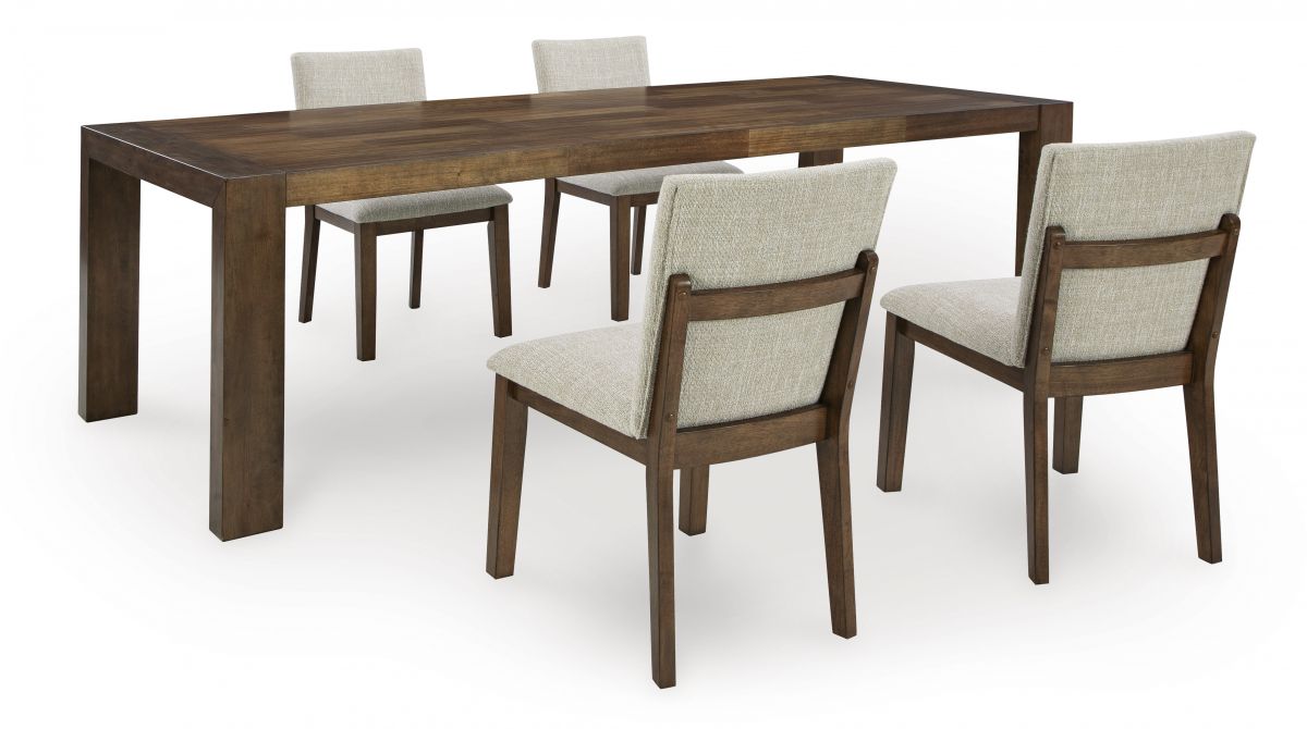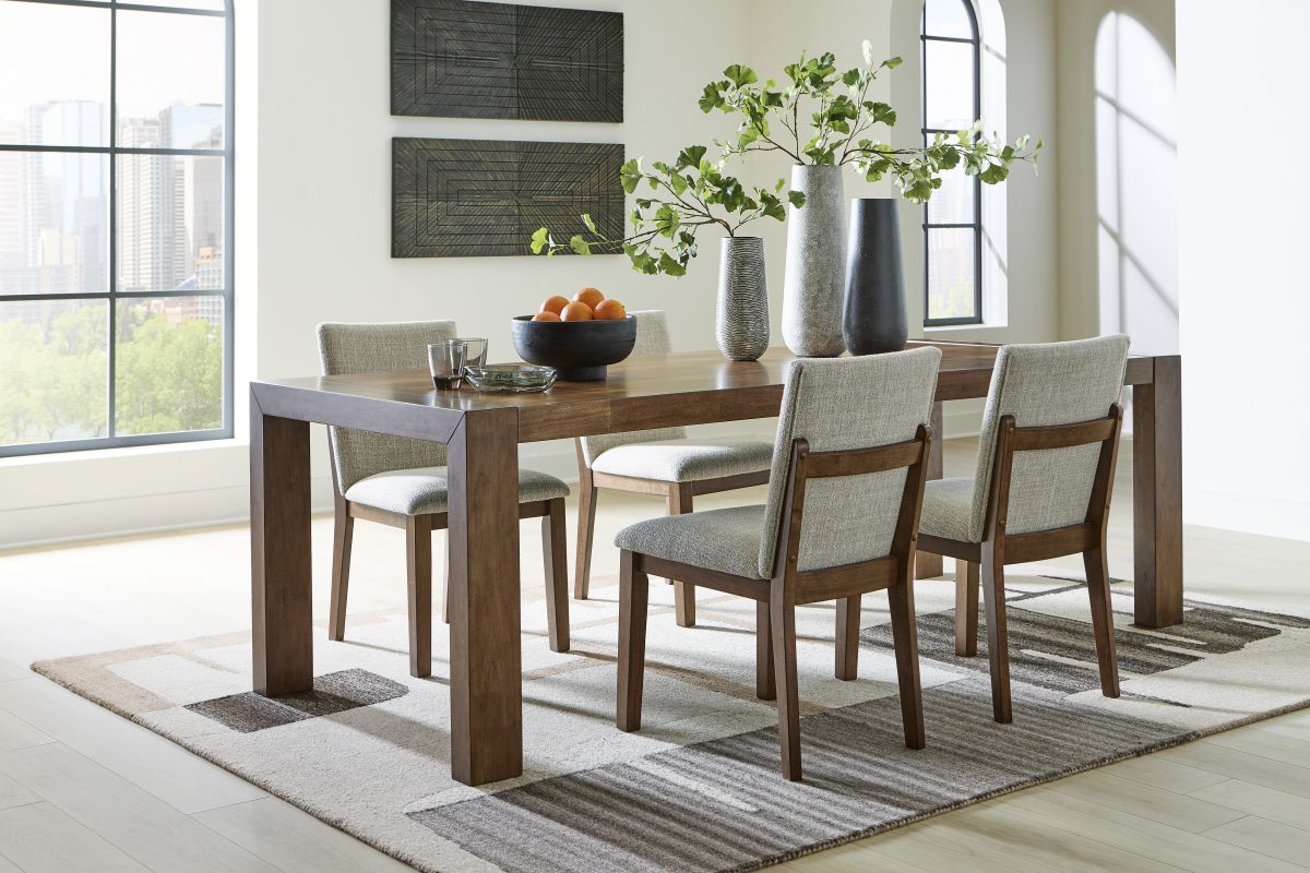 Experience worry-free living with this dining package. Designed to effortlessly blend casual and refined aesthetics, the rich brown butcher block veneer exudes a modern, relaxed vibe you'll love. And the washable Next-Gen Nuvella™ performance fabric handles life's little messes with ease. Styled to comfortably seat eight, this set makes room for one and all.