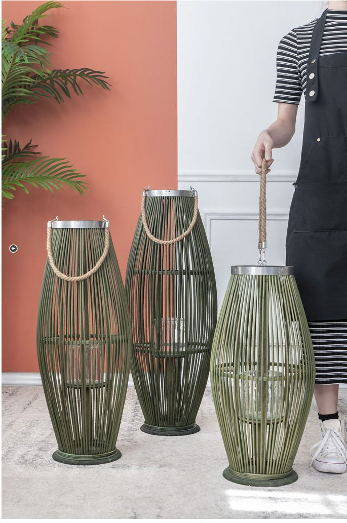 This medium boho chic bamboo lantern features a woven design and glass hurricane for a cool, understated style. Crafted with a simple hemp rope handle, it’s a smart designer’s favorite touch for neo-southwest decor. With its elegant profile and tapered top and bottom, it does a lot of the heavy lifting when displayed on tabletops or set alongside key furniture pieces.