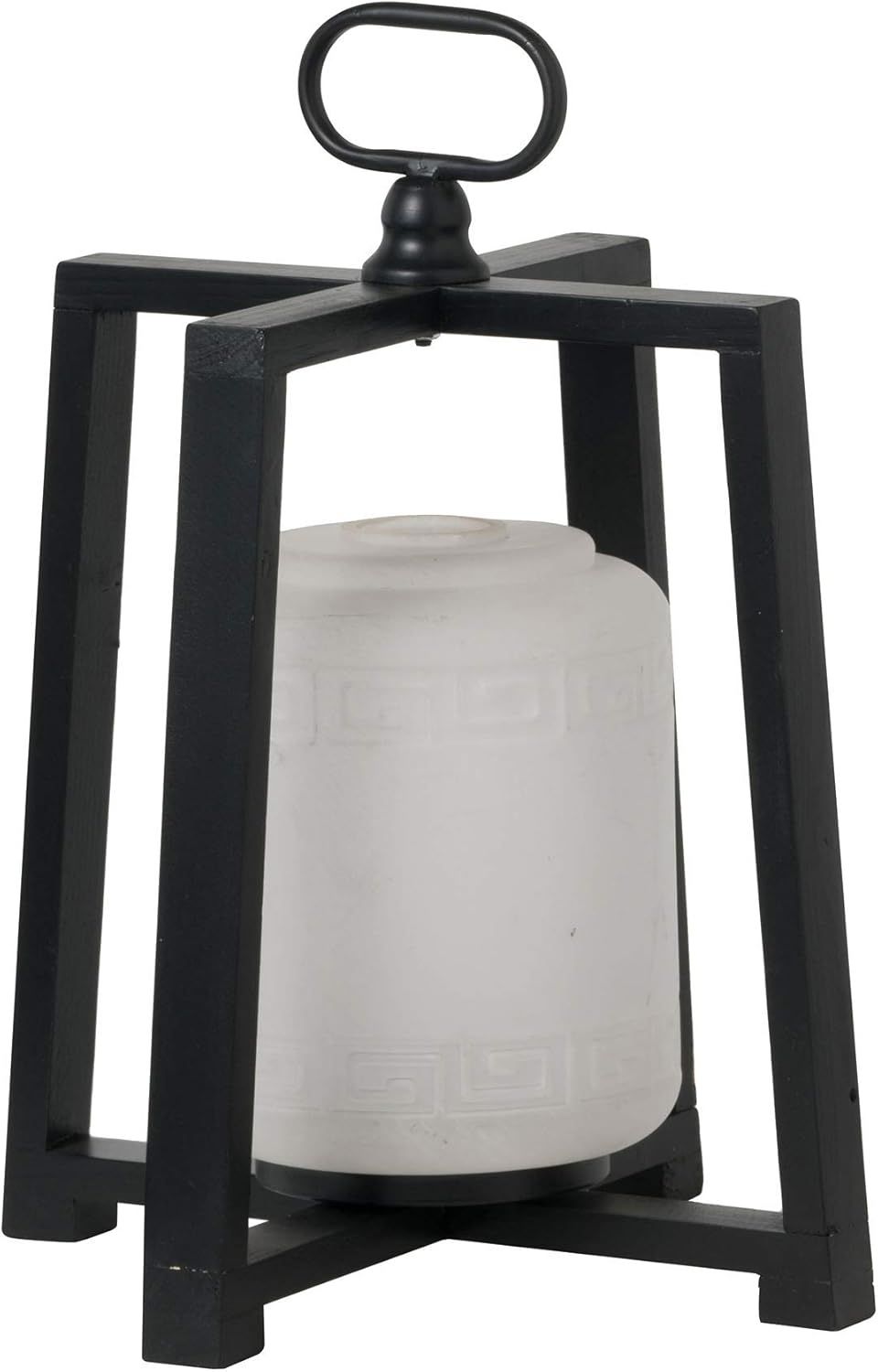 Add a warm glow to your room with this sleek, industrial lantern featuring a glossy white hurricane housed within a rugged black frame. This versatile piece featuring classic finishes and subtle geometric detailing fits virtually any style and space. Feature this handsome lantern in a rustic great room, chic dining room, or luxurious master bathroom to enjoy the luminous ambiance it creates.