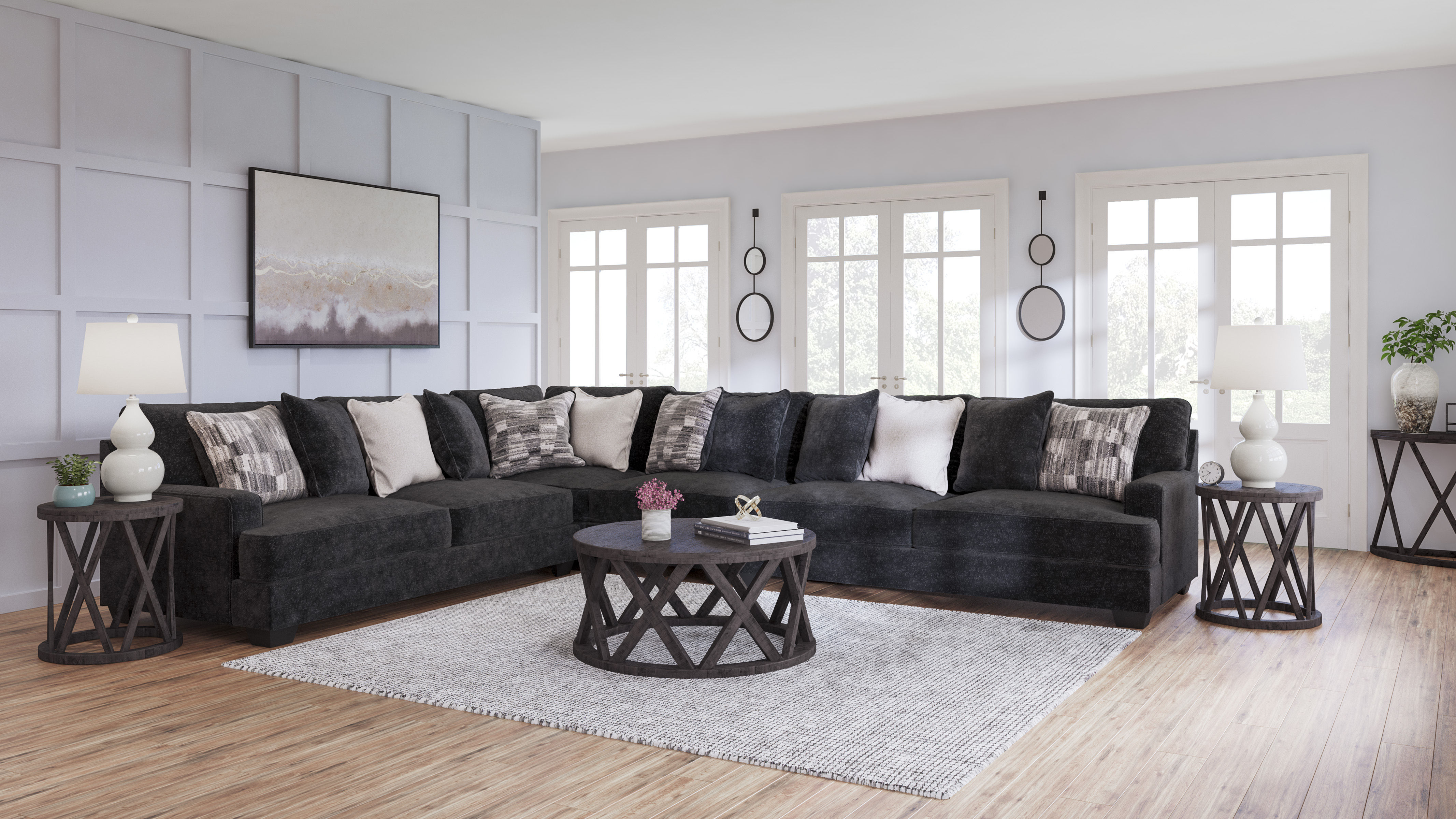 A match made in heaven, the Lavernett sectional marries a cool, contemporary look and a decadently soft, plush microfiber feel. This irresistibly comfortable union is love at first touch at the end of a long day, or anytime you're ready to get serious about relaxing. Say I do to big-time comfort and style flanked by neatly finessed track arms in a clean, straightforward design. A medley of pillows in cream, black and gray blends effortlessly with any setting.