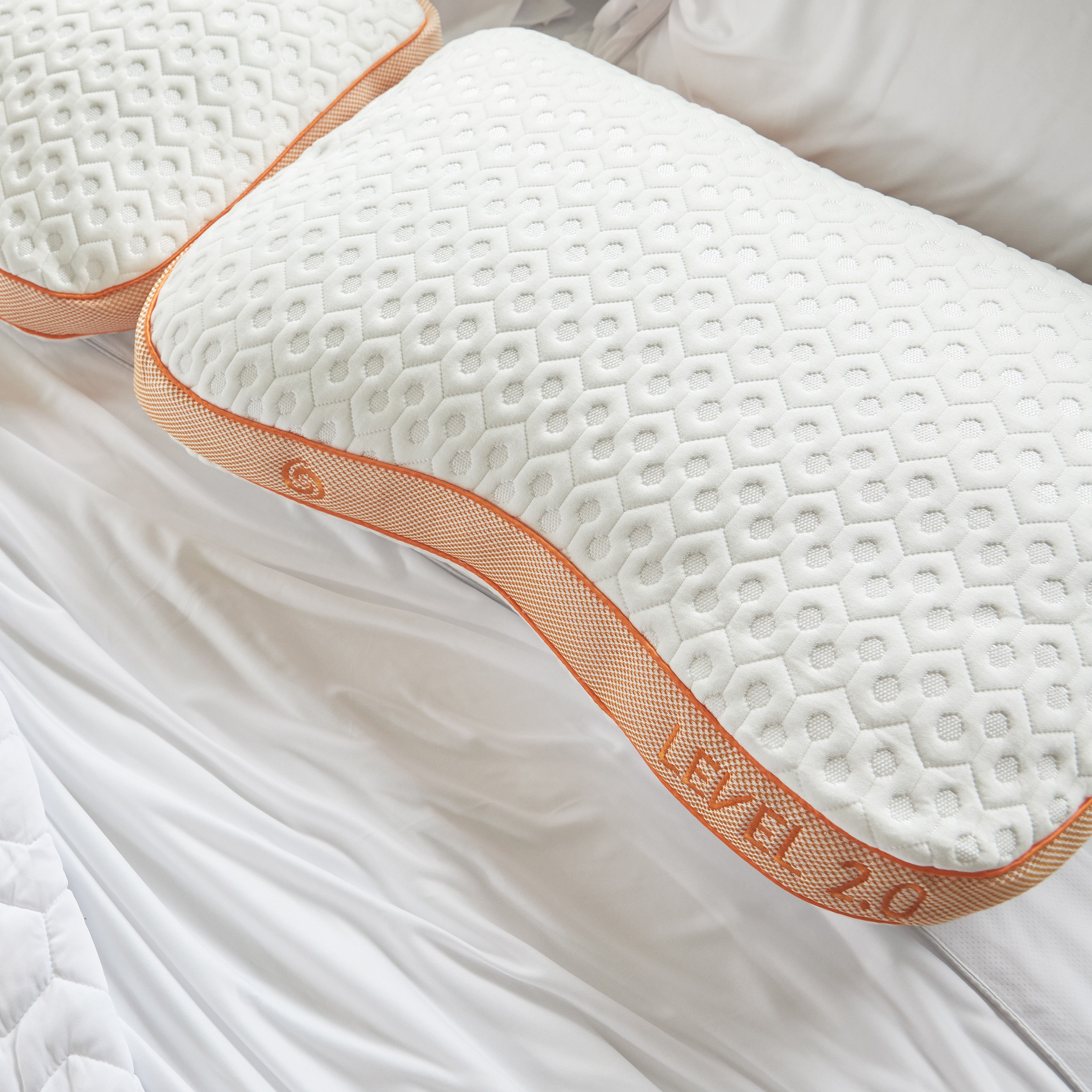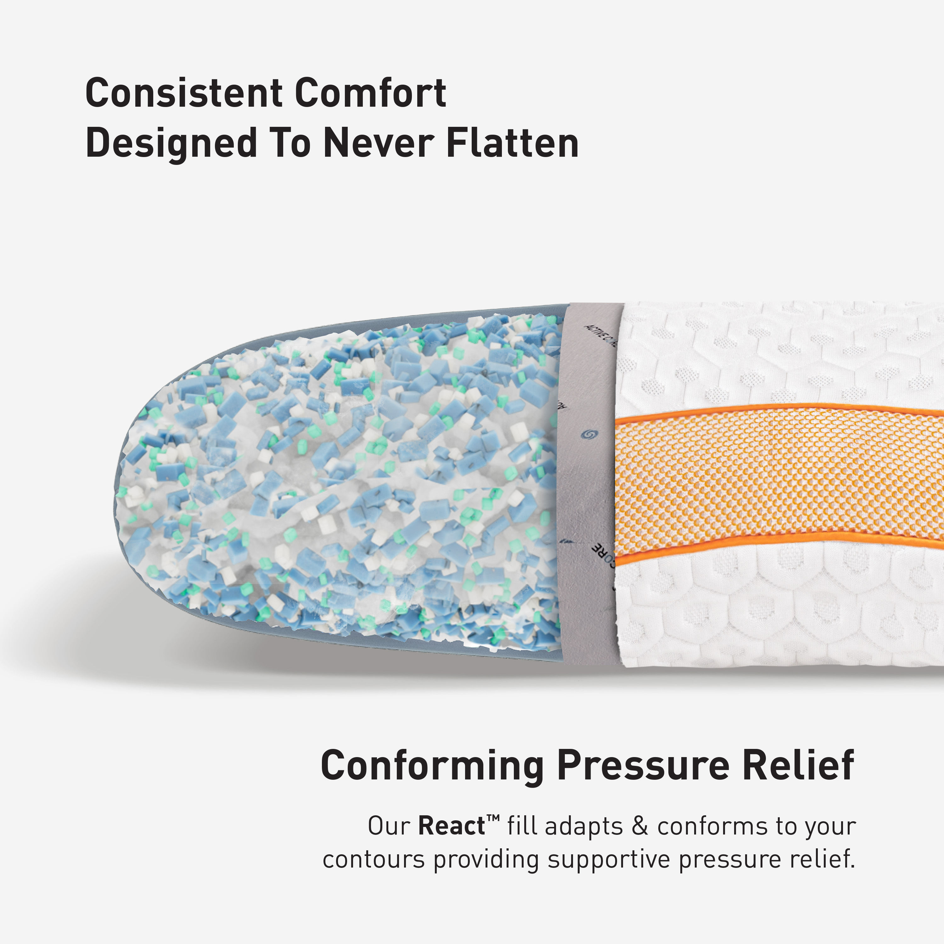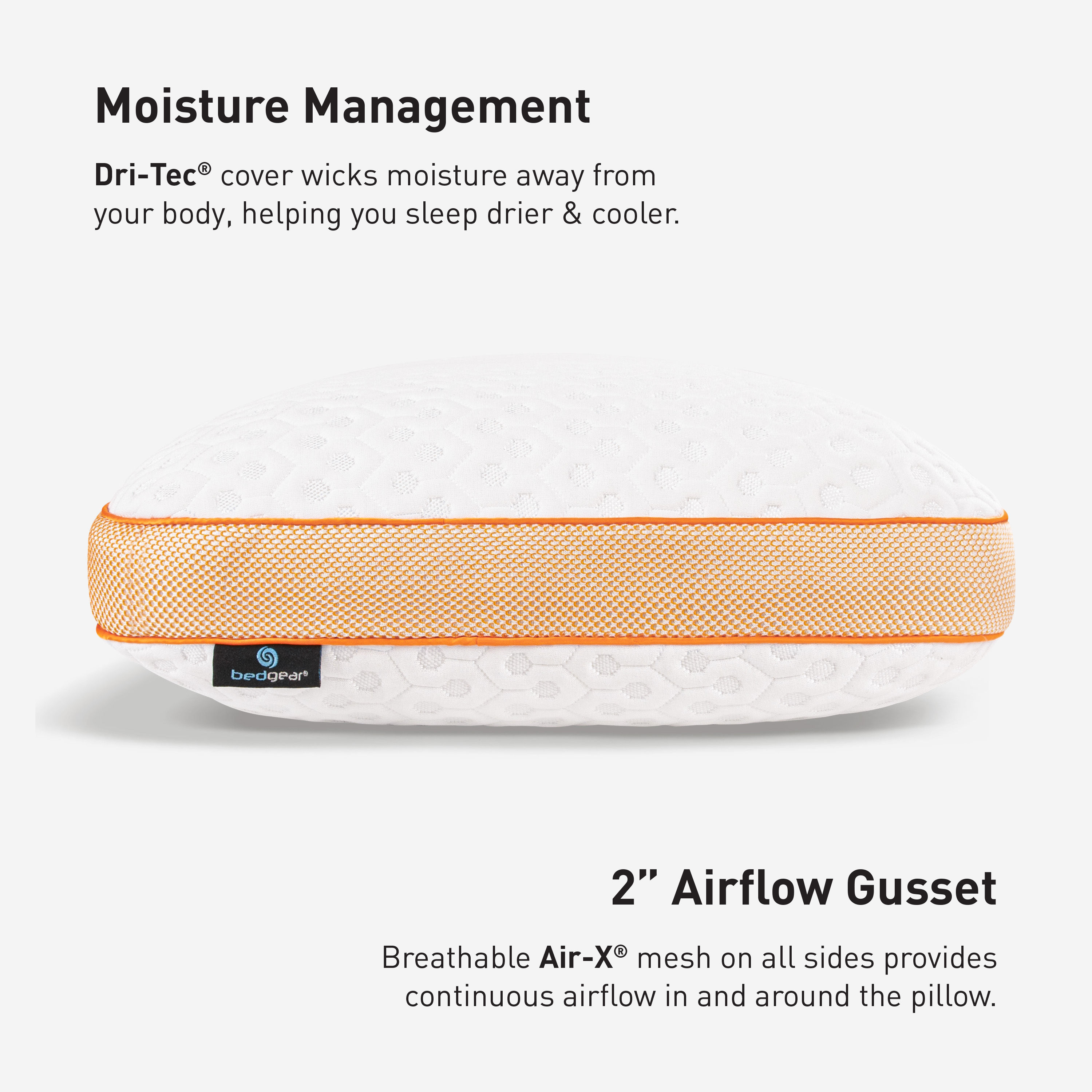 Curved to fit you, the Level 2.0 Performance® pillow series has a crescent-shaped design to cradle your head, neck and shoulders. The latest Dri-Tec® moisture-wicking performance fabric, with a hexagonal pattern and greater loft, facilitates airflow around your sleep environment. The pillow's ergo-molding React® blend core is a combination of foam cubes and silk-feel fibers that creates support and conforms without pushback. Patented Air-X® ventilated side panels enhance air circulation throughout the pillow, moving excess heat away from your head, neck and shoulders. Filter fabric behind the Air-X® panels helps prevent allergens and dander from entering the pillow core.