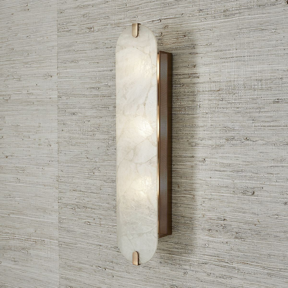 A glimmering tablet of natural quartz crystal is held between two light antique brass finish clasps. The perforated side panels allow for flattering and softened illumination, can mount either Horizontal or Vertical. With 3-60 watt max, candelabra sockets. Bulbs not included.