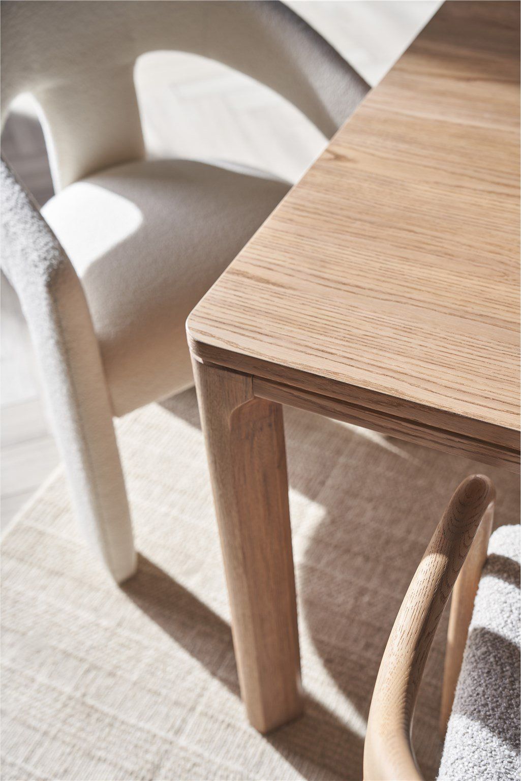 The Malone Dining Table, with its very simple silhouette and narrow legs, is finished in a versatile Natural Oak. Its understated design makes it a perfect complement to a wide spectrum of interior tastes and color schemes, embodying a minimalist elegance that enhances any dining space.