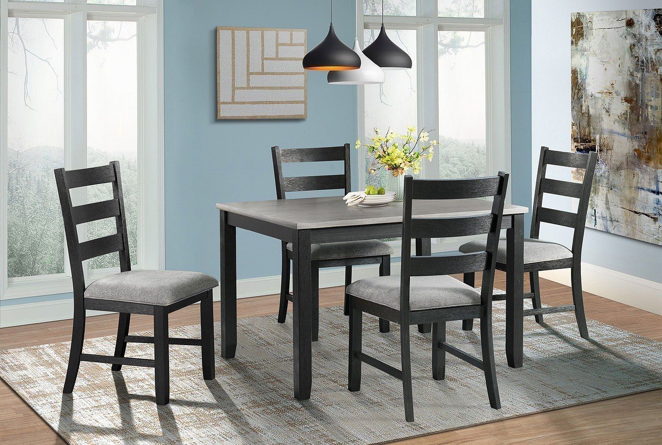 The Martin counter height dining set is the perfect addition to your home! This set includes a table and four side chairs. The square table design will make it an easy fit in your home. The chairs feature a ladder back design and an upholstered seat in a grey fabric. The wire brush, black finish on the table base and chairs is truly unique, adding instant flair to this set. The table’s two-tone finish will give the updated look your dining room has been craving!