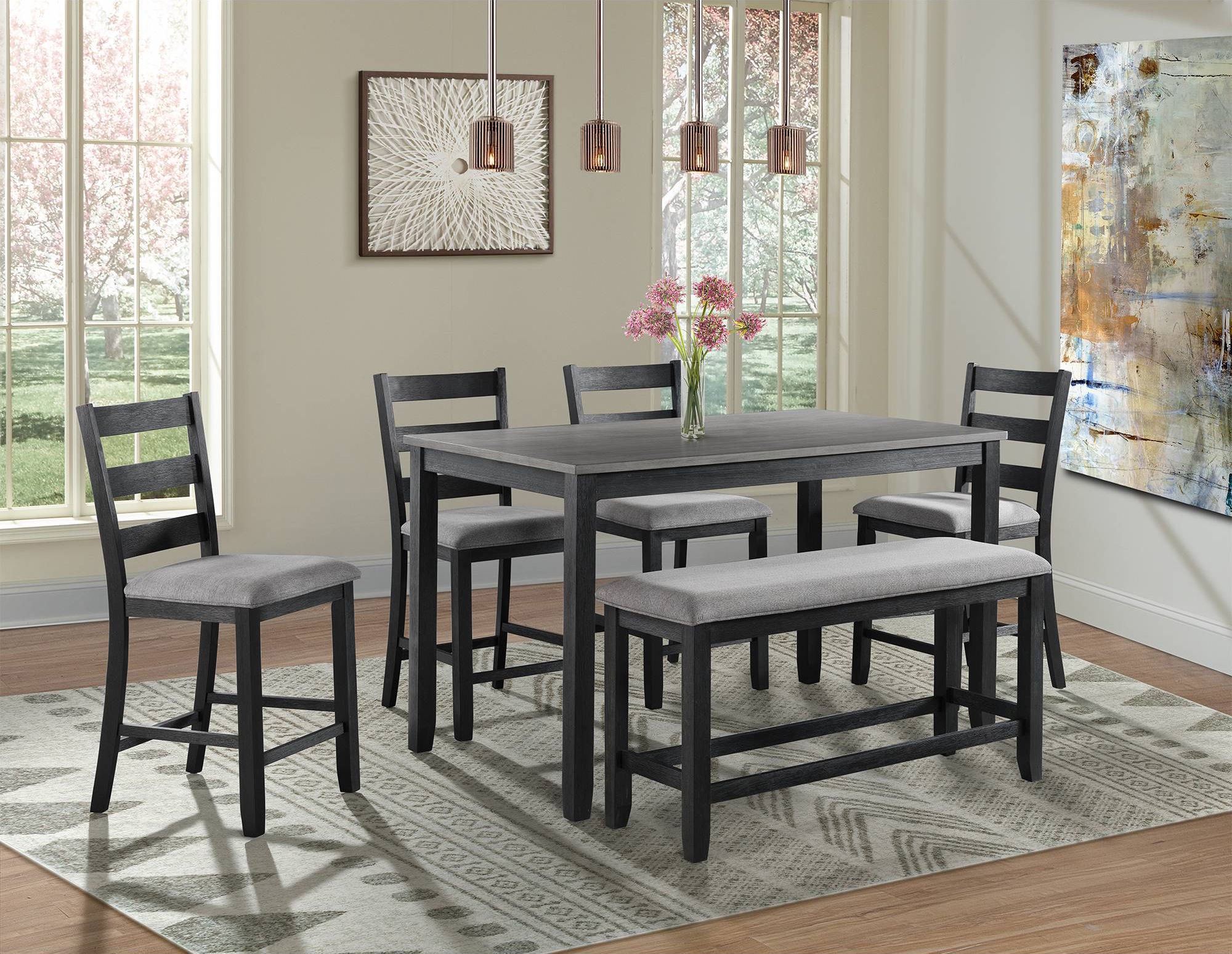 The Martin counter height dining set is the perfect addition to your home! This set includes a table, four side chairs and a dining bench. The rectangle table design will make it an easy fit in your home. The chairs feature a ladder back design and an upholstered seat in a grey fabric. The wire brush, black finish on the table base and chairs is truly unique, adding instant flair to this set. The table’s two-tone finish will give the updated look your dining room has been craving!