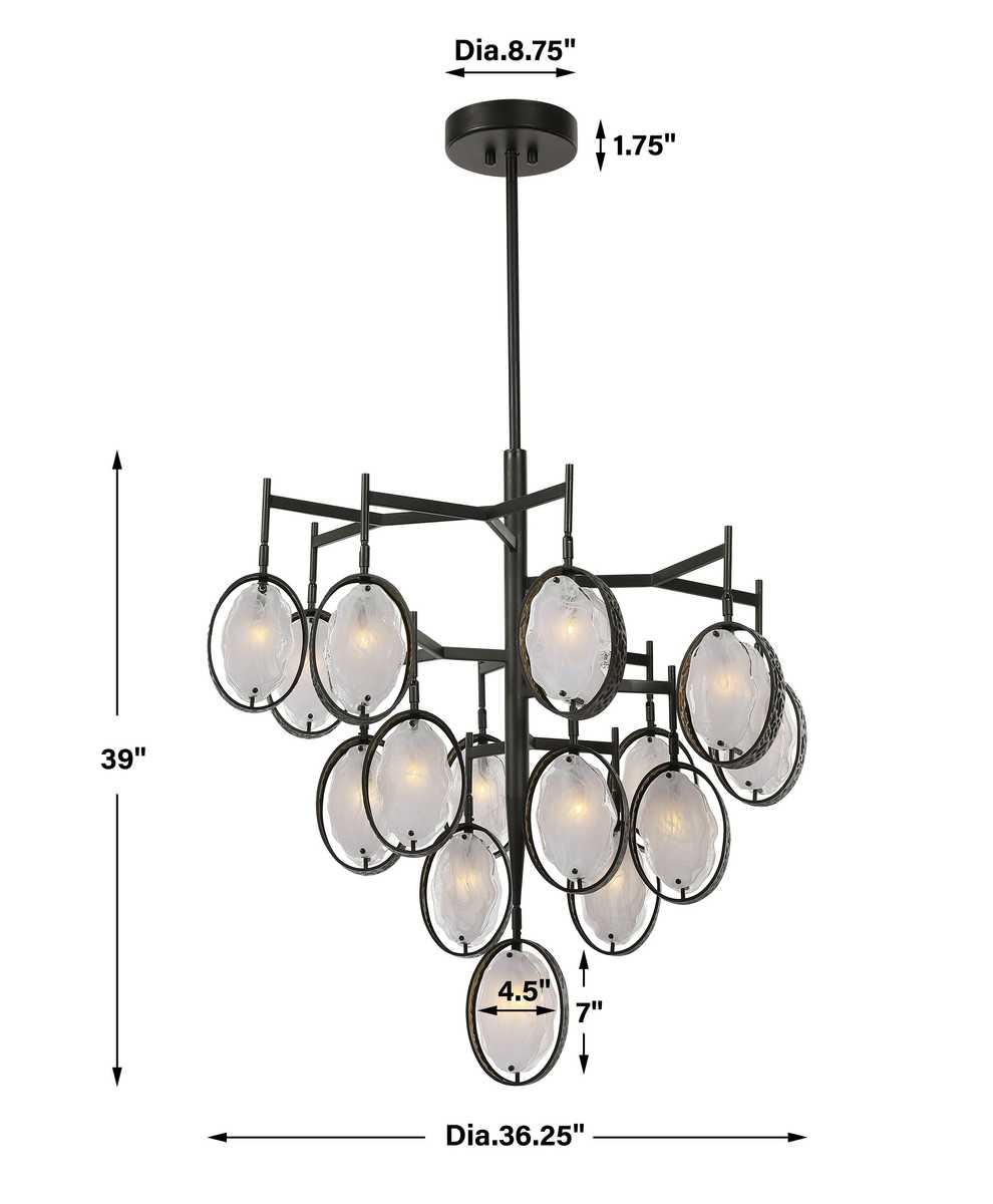 Rings of dark hammered bronze with a subtle golden interior. Inspired from mid-century modern design, each ring holds two handmade artisan inspired clear and white swirl glass ovals. 15-40 watt max G9 sockets. Bulbs NOT included. Supplied with 15' wire, 3-12" stems and 1-6" stem for adjustable installation.
