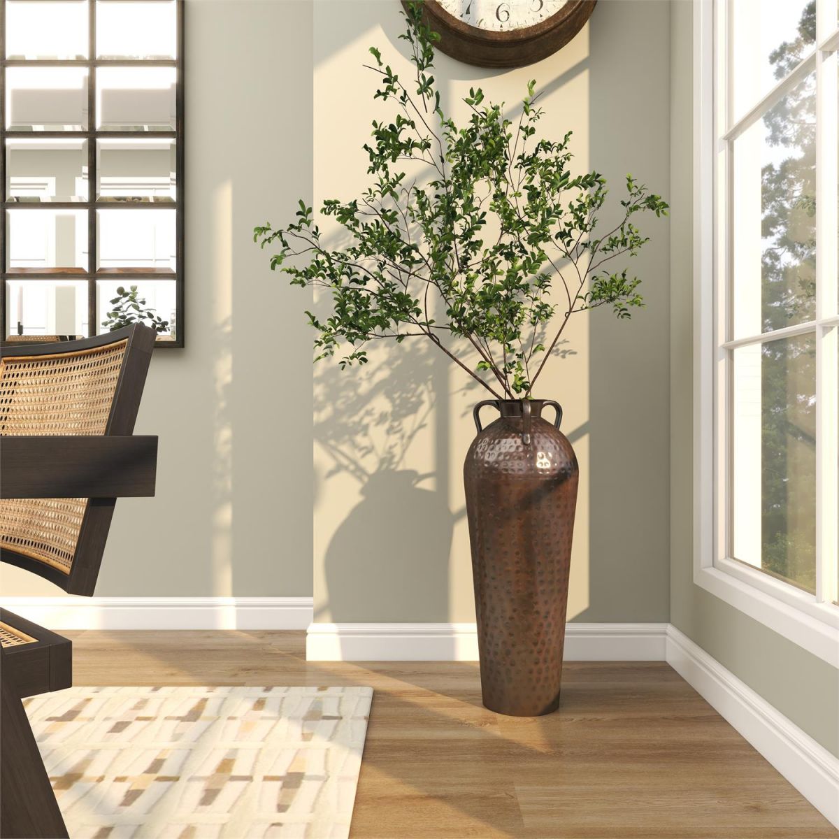 Designed with rugged beauty and an earthy charm, where natural simplicity, warmth, and organic materials create a wholesome atmosphere. Brown decorative vase is crafted with solid iron material, making it both durable and stylish. Amphora home decor vase showcases a polished and hammered brown finish, adding an elegant touch to any space. Iron vase features a tall jar shape and comes with three identical neck-to-shoulder handles.
