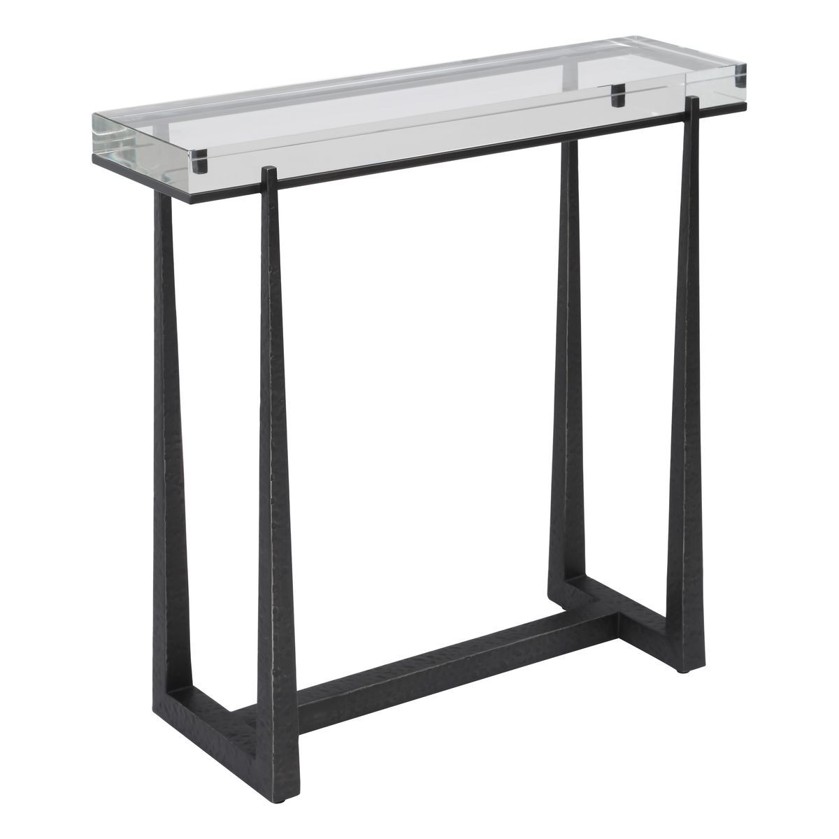 This elegant accent table adds a touch of luxury to any room. The textured dark bronze finished iron legs perfectly support and accentuate the thick crystal top.
