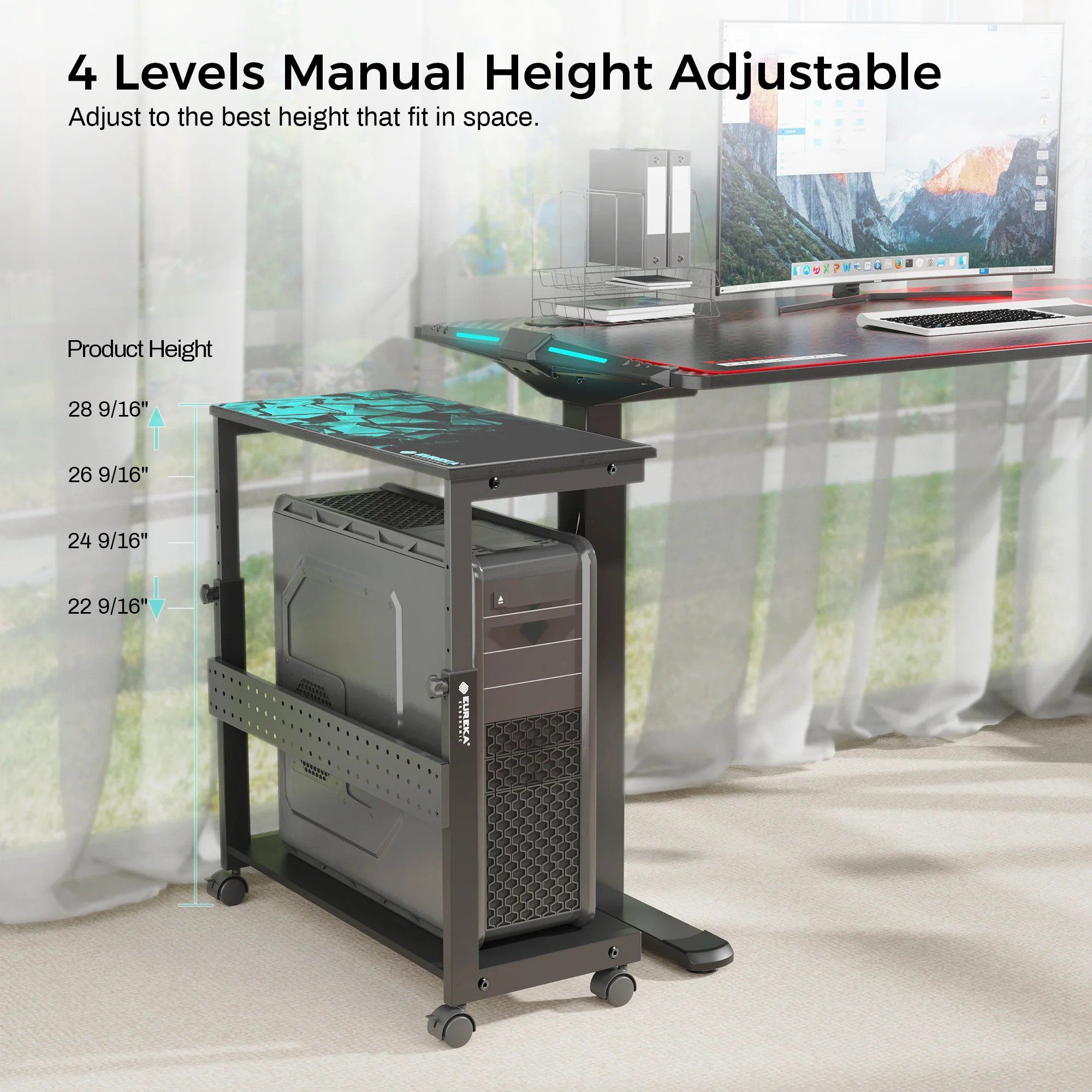 A true productivity boost for gamers and the office! Experience easy mobility and improved airflow with our Mobile CPU Cart. This versatile two-tier design is compatible with a wide range of computer cases, including full-tower ATX cases. The top of the cart is perfect for parking your printer, while the bottom holds your PC tower. Manually height-adjustable from 23 1/4'' to 33 1/4".