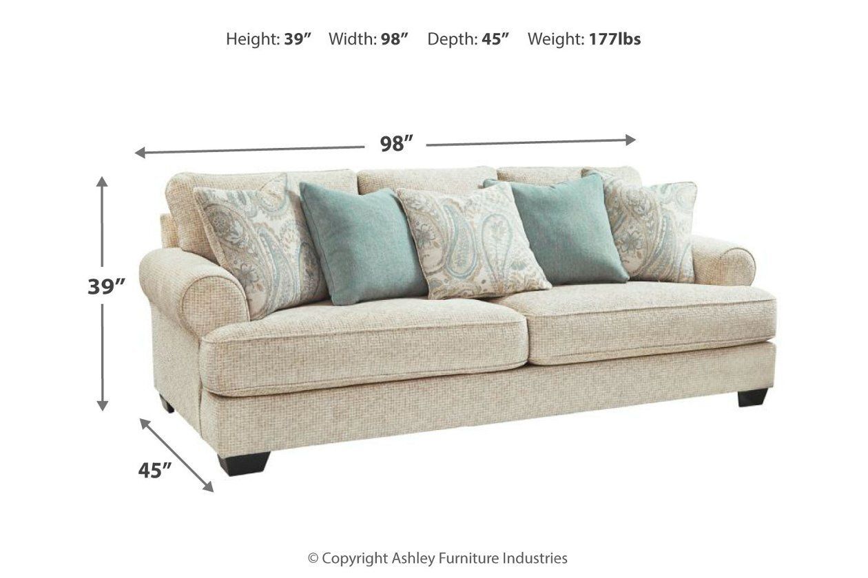 The Monaghan sofa strikes a beautiful balance between classic and current. Traditional elements include t-cushion seating and setback roll arms, angled for modern flair. Posh collection of pillows in spa mist and jacquard paisley make a muted, mellow complement to the sofa’s casual textured chenille upholstery. Choice of sandstone beige is a light and lovely style awakening.