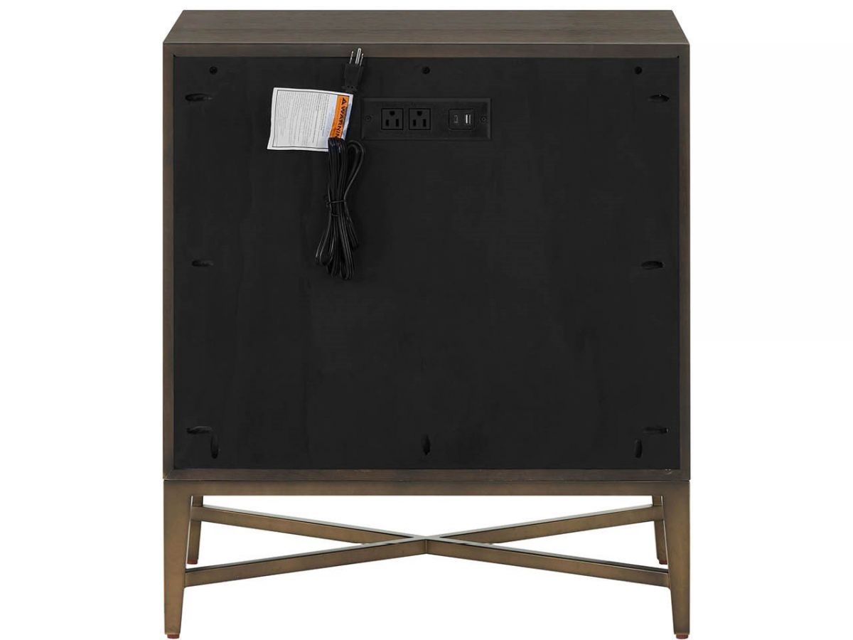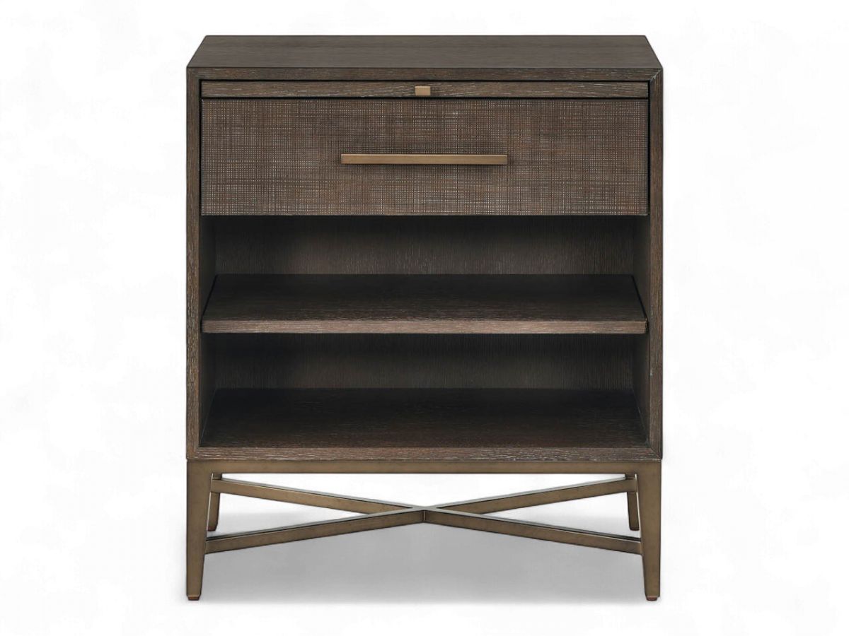The Montclair Nightstand features elevated design with one Embossed Cocoa drawer and a convenient pull-out shelf, all supported by an elegant Smoked Gold X-frame base. This piece exemplifies sophisticated material blending with practical bedside function.