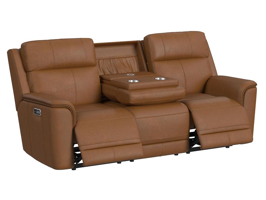 Bring a touch of contemporary style to your home with the Mustang power reclining sofa in brown leather upholstery. The refined stitching showcases that it has a classic and casual design. When you sit down on this sofa you'll be experiencing all the luxurious modern comforts with an adjustable headrest, USB charging ports as well as a drop-down table in the middle that has dual cupholders. These features will ensure you stay relaxed and charge your devices while you watch your favorite shows or movies after those long. hard days.