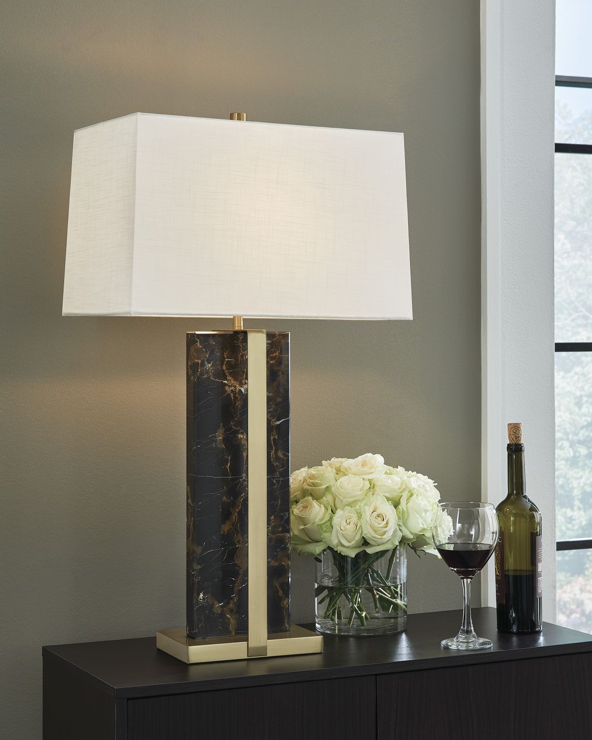 A little glam goes a long way. This table lamp embraces the best of contemporary style with its hard-to-miss sleek black marble base and glimmering goldtone accents. How divine on a mantel, dining server or home office desk.