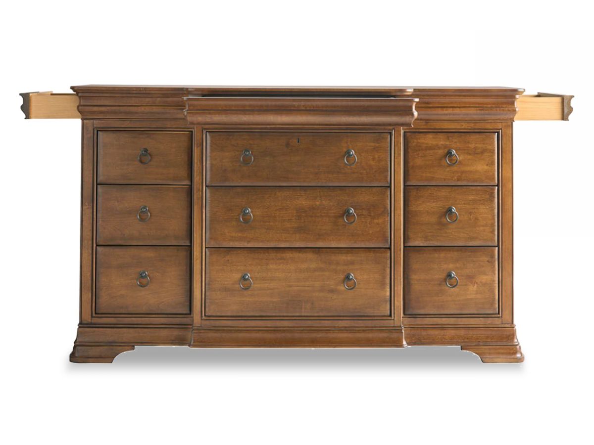 The New Lou wooden dresser features a classic, timeless design with a warm, medium-brown cognac finish that highlights the natural grain of the wood. Its symmetrical structure includes a total of nine drawers: three smaller drawers on each side and three larger, spacious drawers in the center, providing ample storage for clothing, linens, or accessories. Each drawer is adorned with a simple yet sophisticated metal ring pull in a dark, antique finish, adding a subtle contrast to the wood.