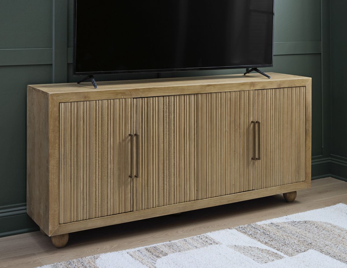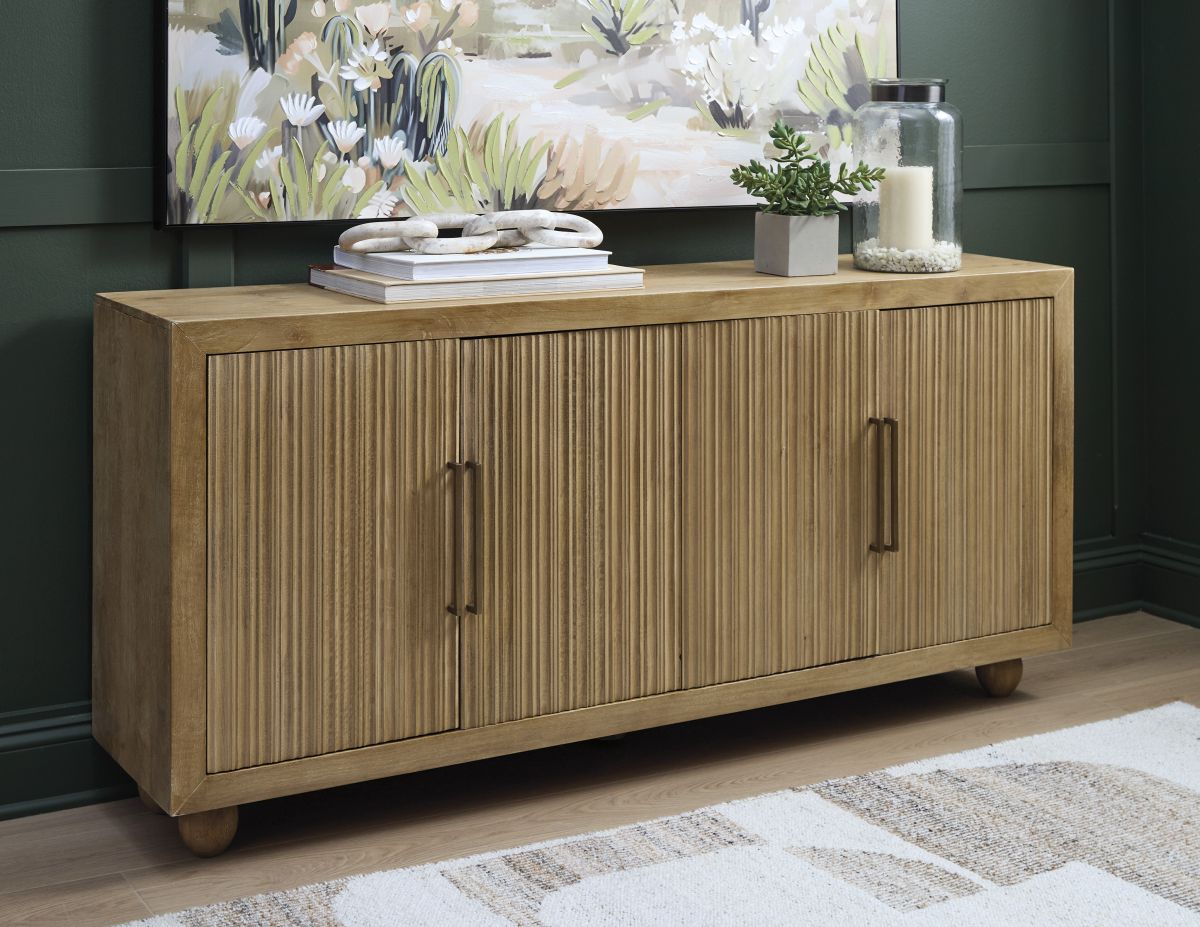 This accent cabinet offers abundant storage with casually cool style and versatility. Its four doors, accented with fluting and goldtone metal pulls, conceal two fixed shelves perfect for dinnerware, cookbooks or anything you want to tuck away. The natural and cream antiqued finish over solid mango wood complements a wide range of decor, making it an easy addition to your living or dining area.