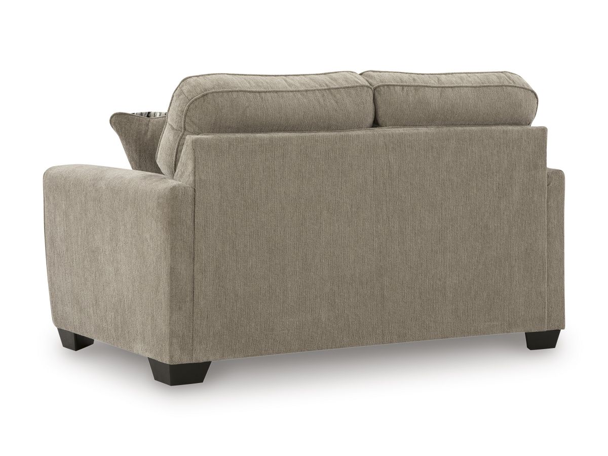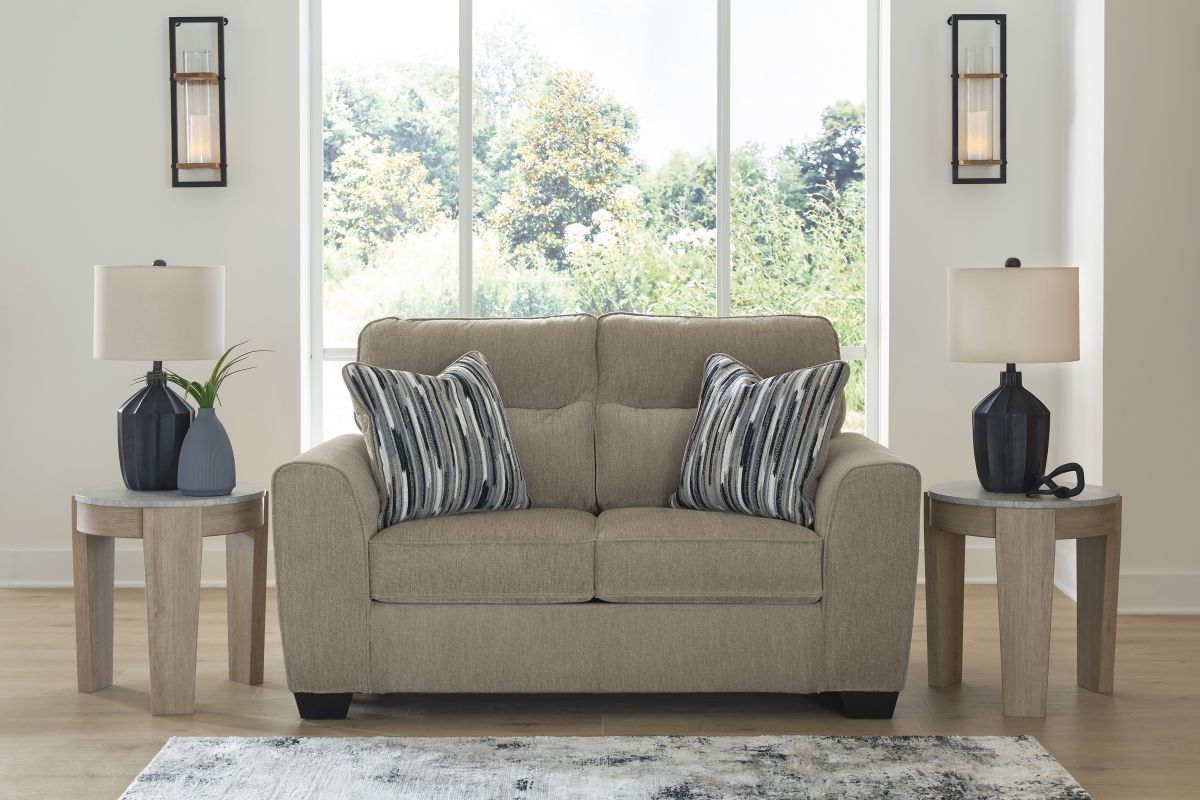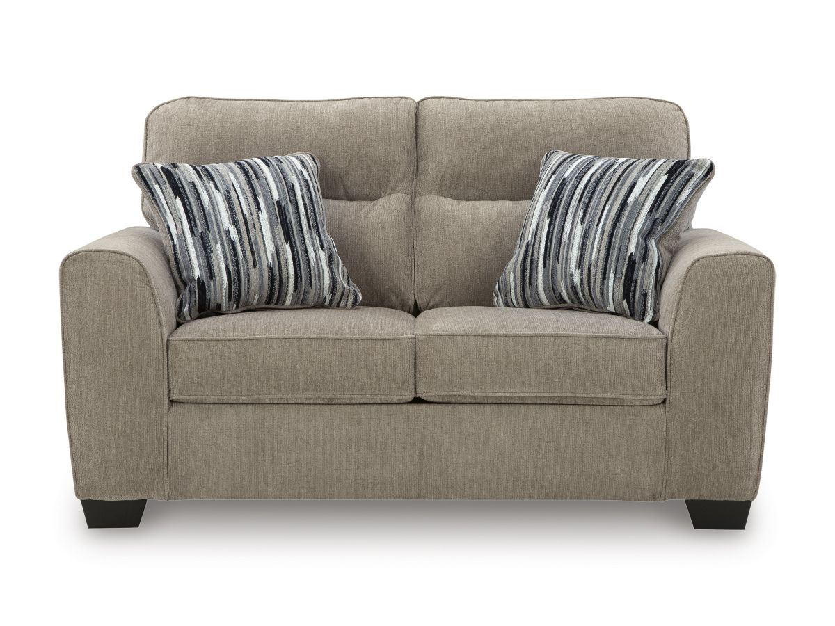 Strike a balance between the indulgent comfort you crave and the contemporary aesthetic you long for. The fabulously soft, mocha-colored upholstery of this loveseat takes neutrals to new heights. Plus there's plenty of room to spread out and relax solo or with your bestie. Geometric-patterned accent pillows perfect the richly on-trend aesthetic.