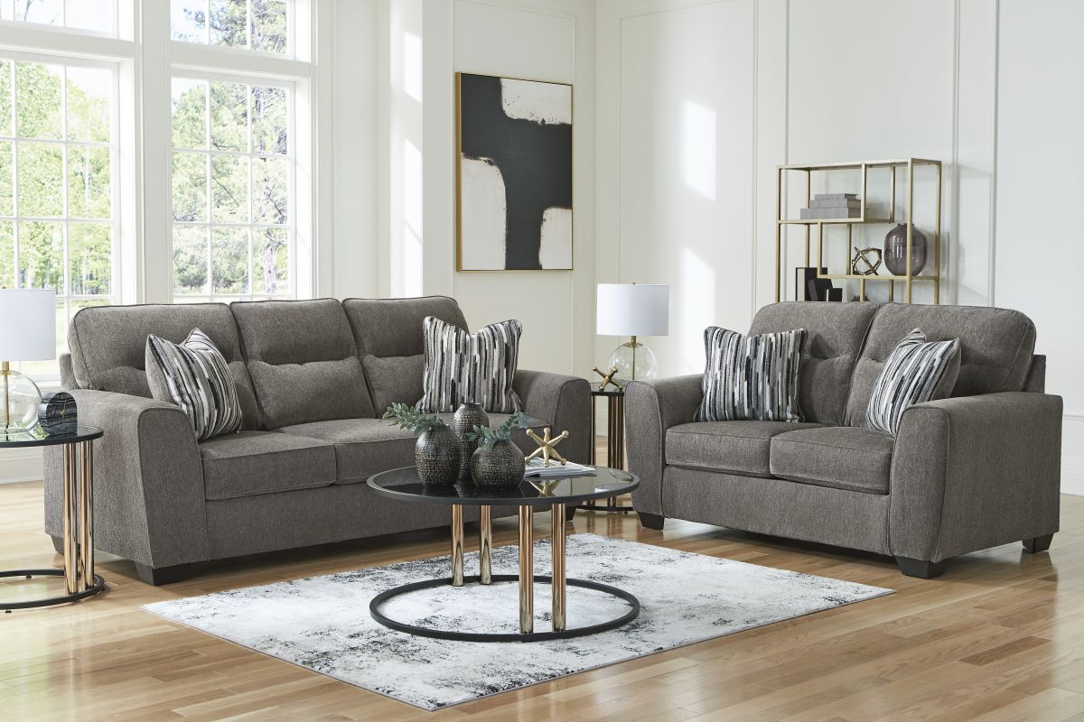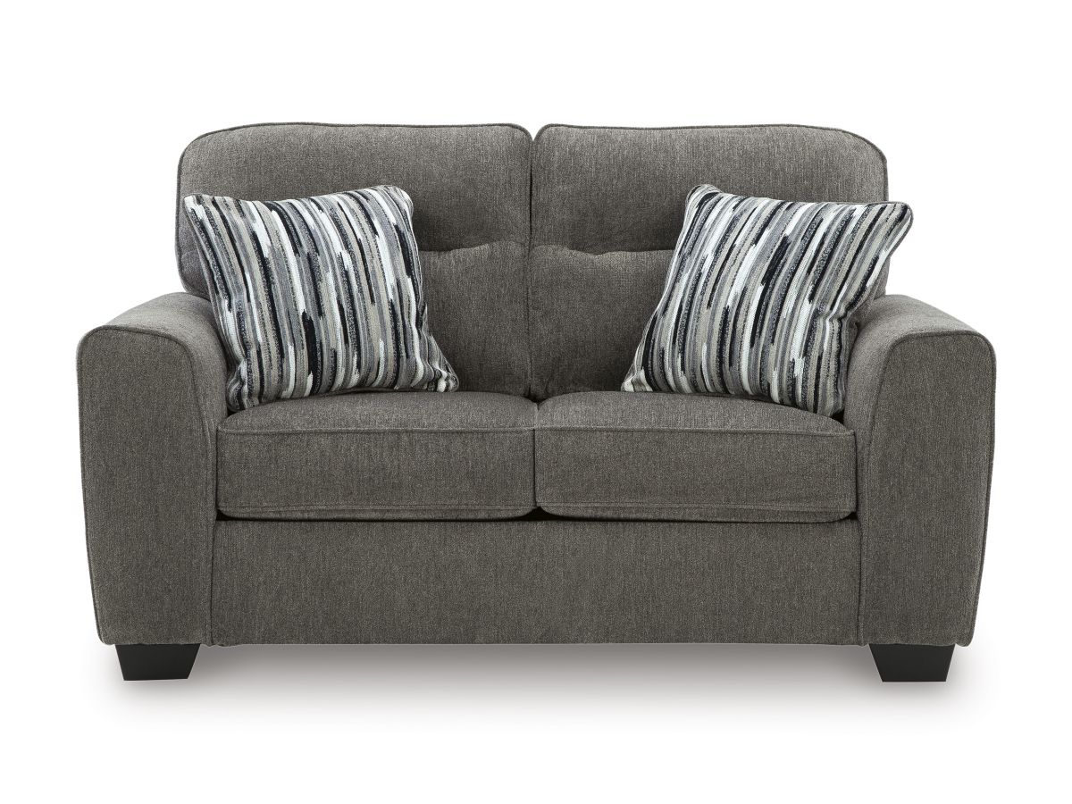 Strike a balance between the indulgent comfort you crave and the contemporary aesthetic you long for. The fabulously soft, graphite-colored upholstery of this loveseat takes neutrals to new heights. Plus there's plenty of room to spread out and relax solo or with your bestie. Geometric-patterned accent pillows perfect the richly on-trend aesthetic.