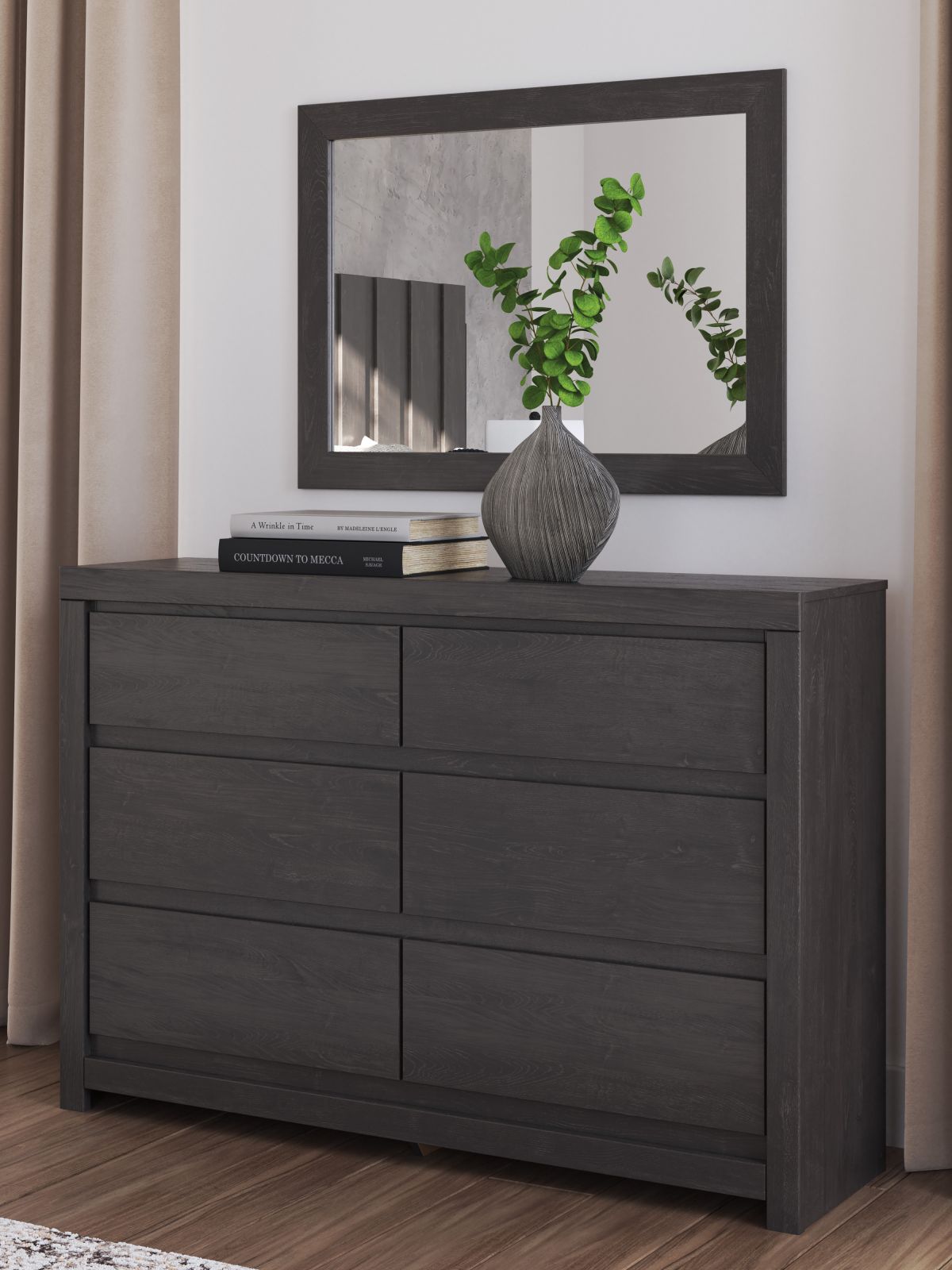 Find serene simplicity in the clean lines and dark neutral tones of this dresser with mirror. It’s a sincere approach to modern elegance, giving you high style at a great value. A sleek hardware-less design creates a fuss-free look. Short on storage? This dresser’s smooth-gliding drawers keep clothes and clutter neatly tucked away.