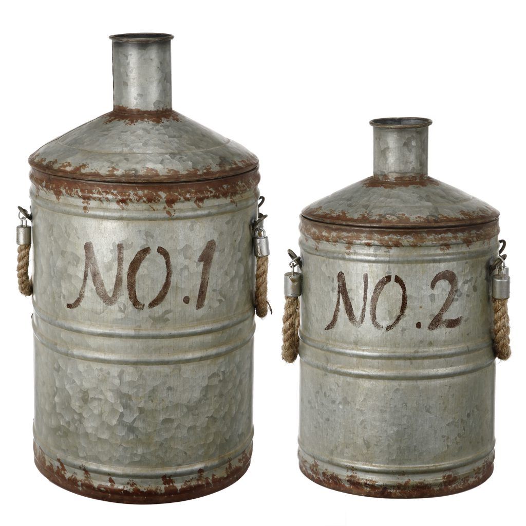 Brimming with rustic charm, this set of Patchin Metal Jugs embodies nostalgic memories of farmhouse living. These galvanized metal jugs feature a weathered rusty finish for an heirloom-like appearance. Each set includes one large and one small jug.